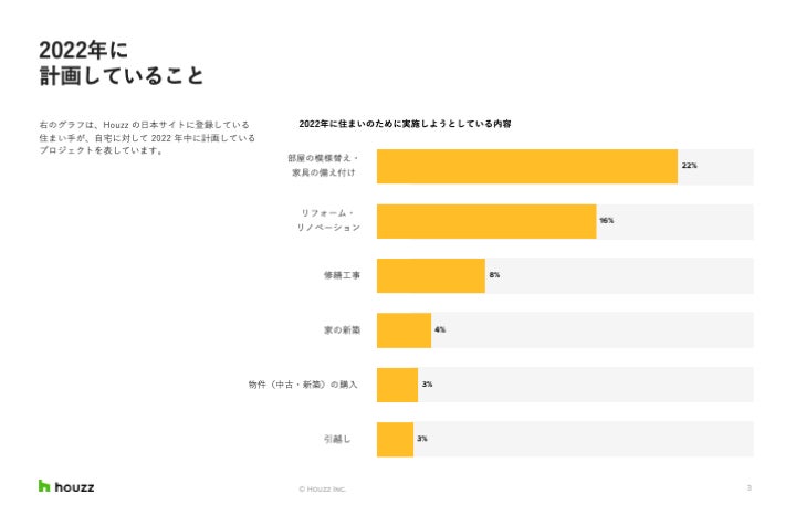 また、2022年も引き続き、22%が部屋の模様替えや家具の備え付けを、16%がリフォーム・リノベーションを計画しています。