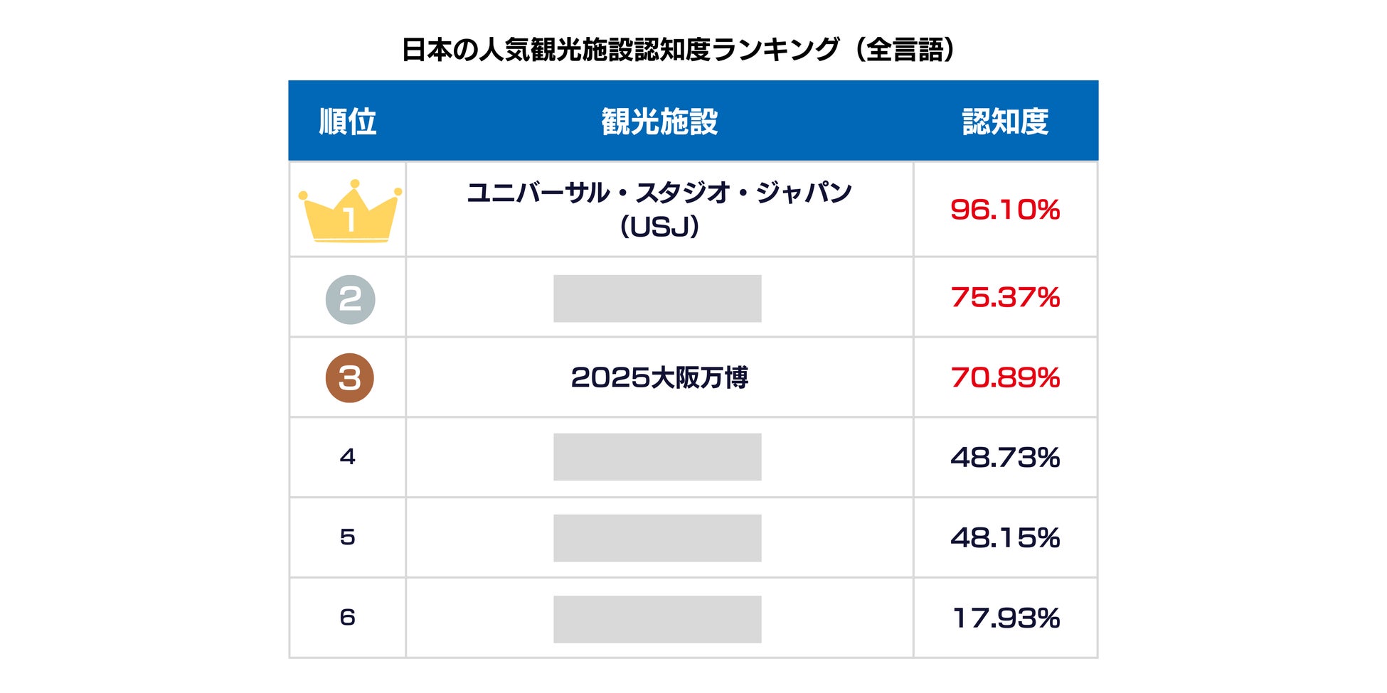 これにより、万博がどの程度の認知を獲得しているのか、また他の人気施設と比べた際のポジショニングがどのようになっているのかが明らかになりました。