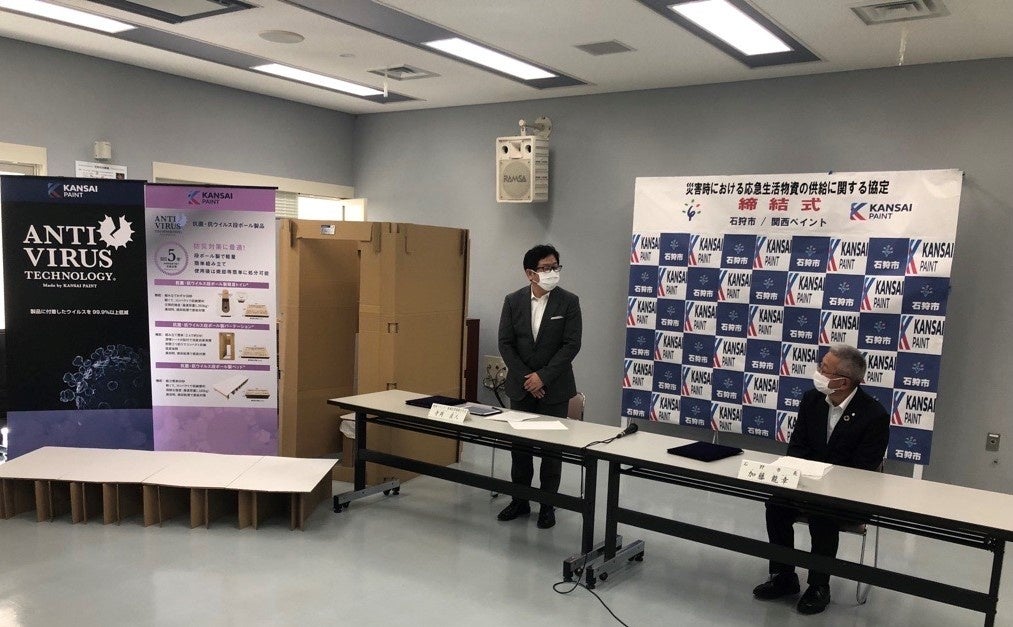 関西ペイントは本協定により、当社独自開発による漆喰(しっくい)塗料技術を活かした抗菌・抗ウイルス防災用組み立て式段ボール3製品を、石狩市に緊急時速やかに供給いたします。