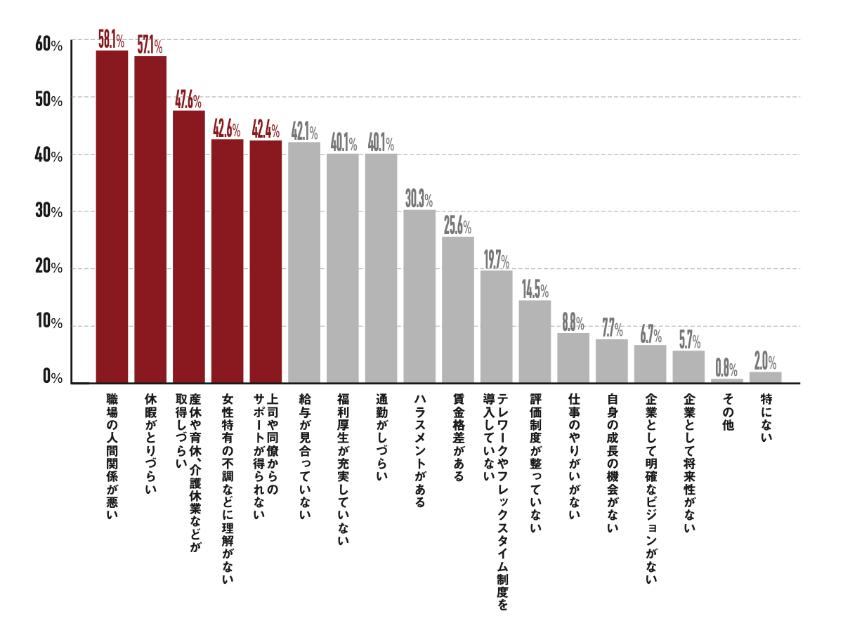 1位は職場の人間関係が良好、2位・適切な給与、3位・福利厚生が充実しているという結果となりました。人間関係を重視する割合は約7割と人間関係を重視する女性たちは多いことが分かります。