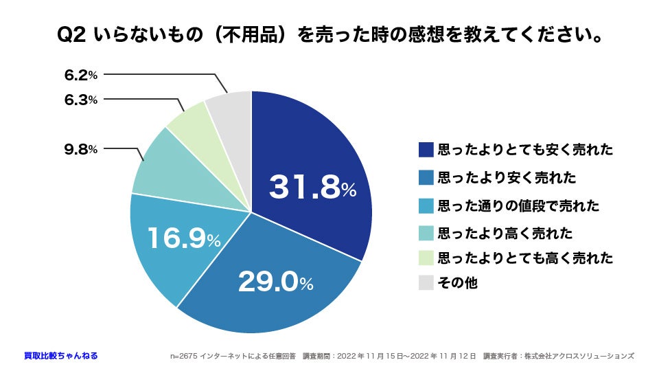 次いで「思ったより安く売れた」という人が多く29.0%で「不用品を売ったときの印象は安かった」と感じた人は全体の60.8%でした。