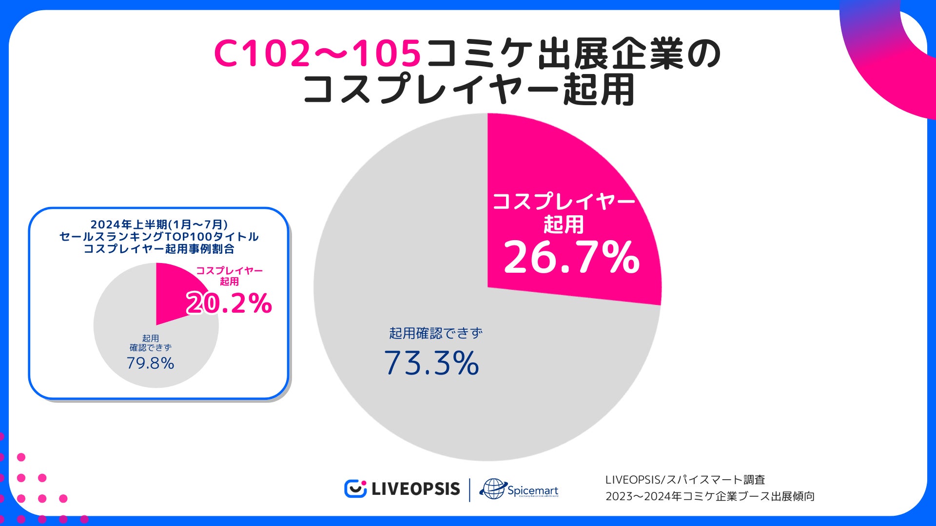 企業ブースではコスプレイヤーを積極的に起用するケースが目立ち、調査した事例のうち26.7%がコスプレイヤーを起用。これは、2024年上半期に弊社でおこなったセールスランキングTOP100タイトルにおけるコスプレイヤー起用実績(※)の20.2%よりも高い結果となり、コミケにおけるコスプレ活用の重要性が高まっていることがうかがわれます。
