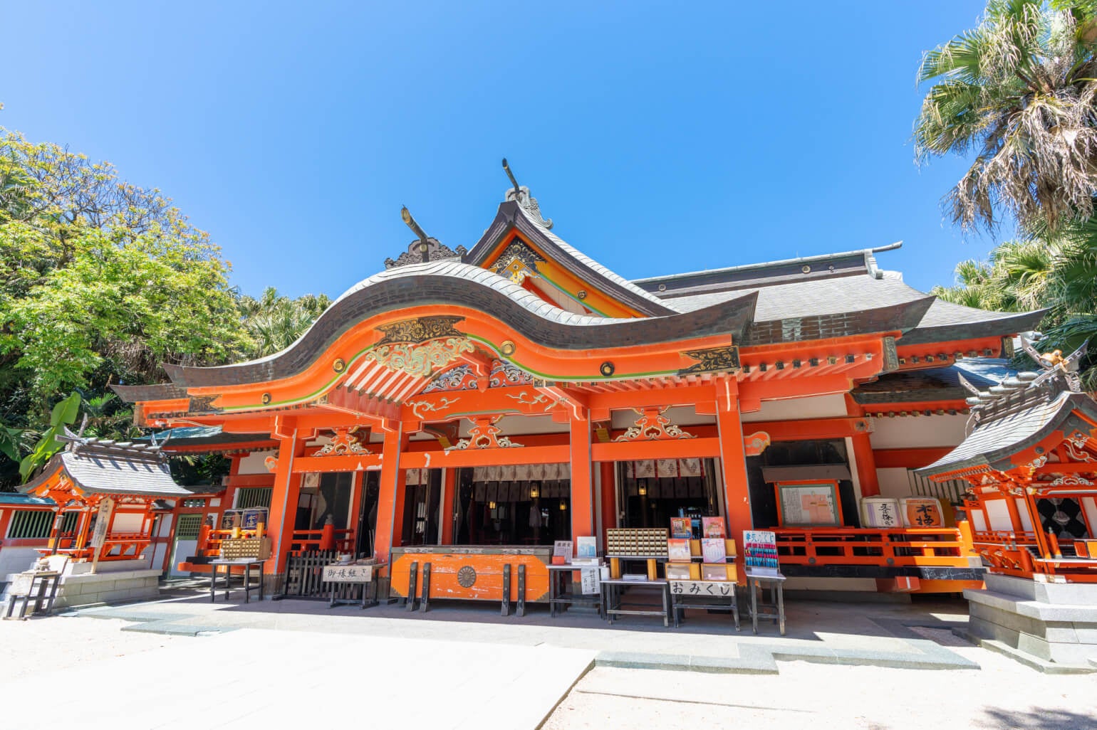 周囲1.5kmほどの小さな島。陸からほど近く、徒歩で橋を渡ります。自然豊かな島そのものがパワースポットと言われ、亜熱帯性植物が生い茂る島の中央には南国雰囲気漂う青島神社が鎮座しています。青島を取り囲む奇岩「鬼の洗濯板」も見どころの一つ。