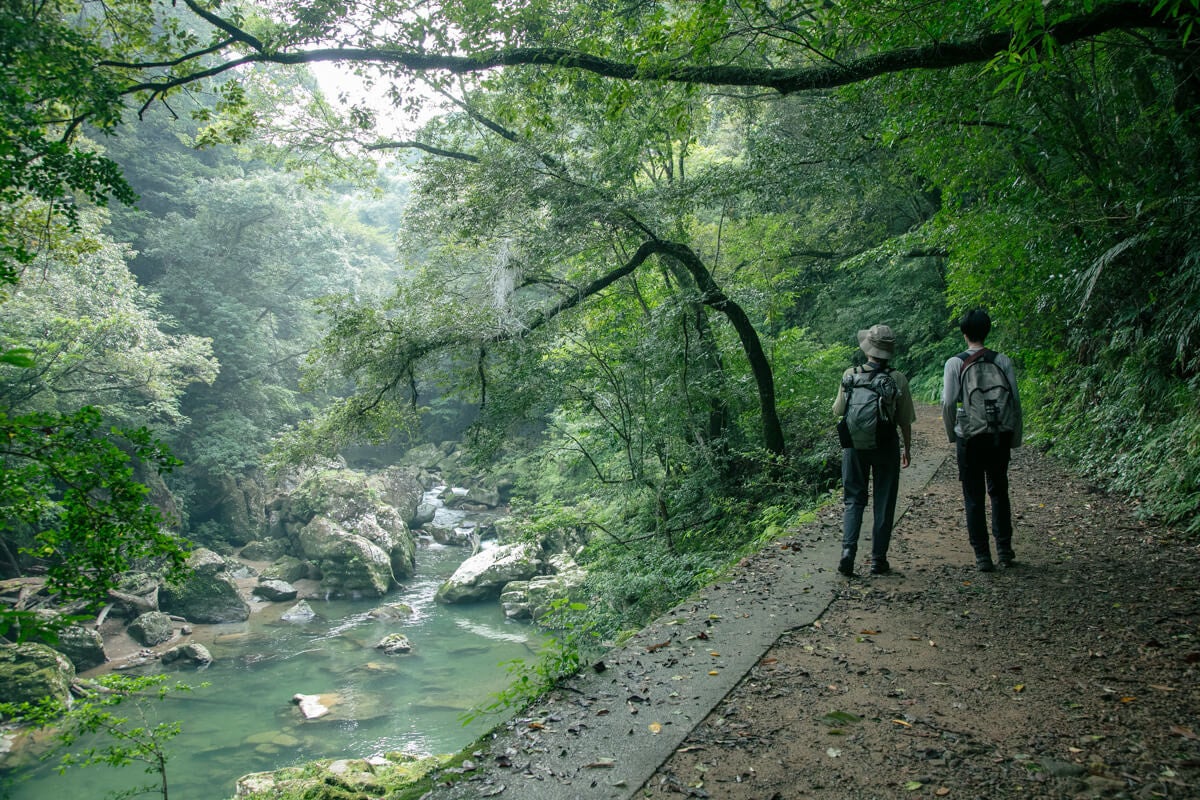 双石山のふもとに位置する加江田渓谷。かつてのトロッコ道をゆるやかに歩く“山歩(さんぽ)”が楽しめます。渓流のせせらぎと木漏れ日の中でのチルタイムを楽しむのがおすすめ。