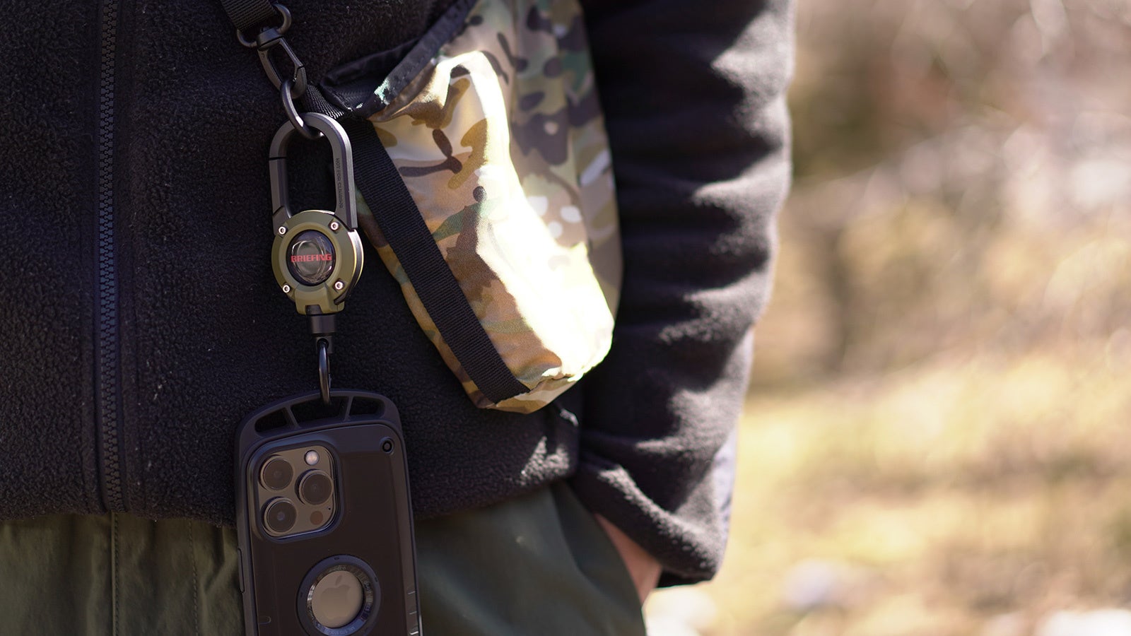 伸縮自在なリール紐を搭載した、カラビナ付き機能性コードリールキーホルダー。マグネット内蔵で、iPhoneやギアの落下/紛失を防ぎます。