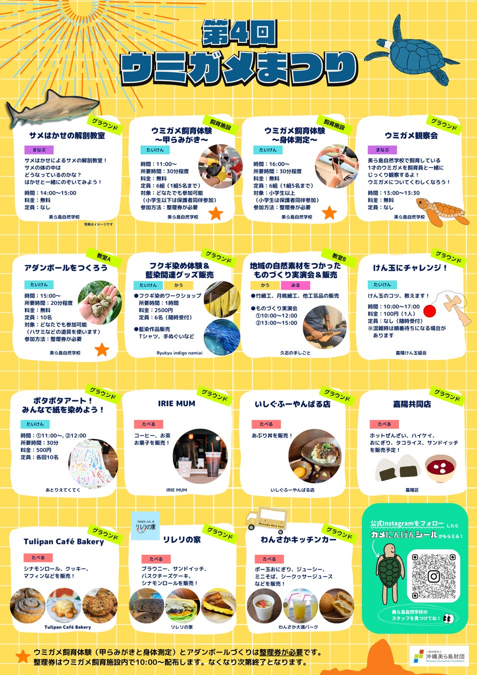 美ら島自然学校を開放し、ウミガメの観察会や飼育体験、そしてなんと今年は「サメ博士とサメの”体の中”をのぞいてみよう!」を実施します!他にも、嘉陽区や安部区をはじめとする久志地域の皆さまによる飲食・体験・物販の出店も予定しておりますので、みなさまのお越しをお待ちしております。