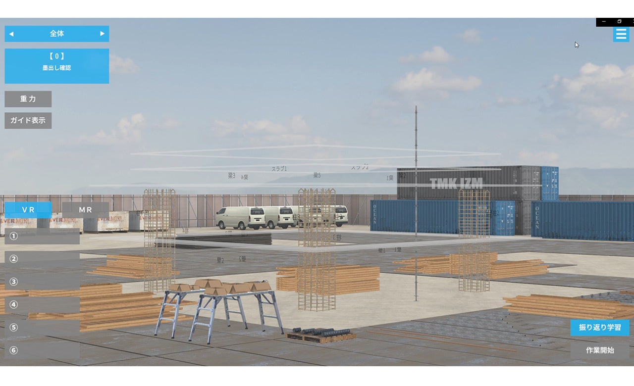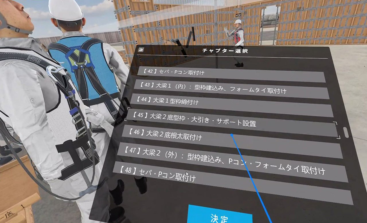 実践的なトレーニングシナリオ: 事前準備から柱、壁、大梁、小梁、スラブの建込み、まとめまで、型枠組立の一連の作業をチャプターに分けて体験できます 。特定のチャプターに絞った学習や、通しでの実施も可能です。