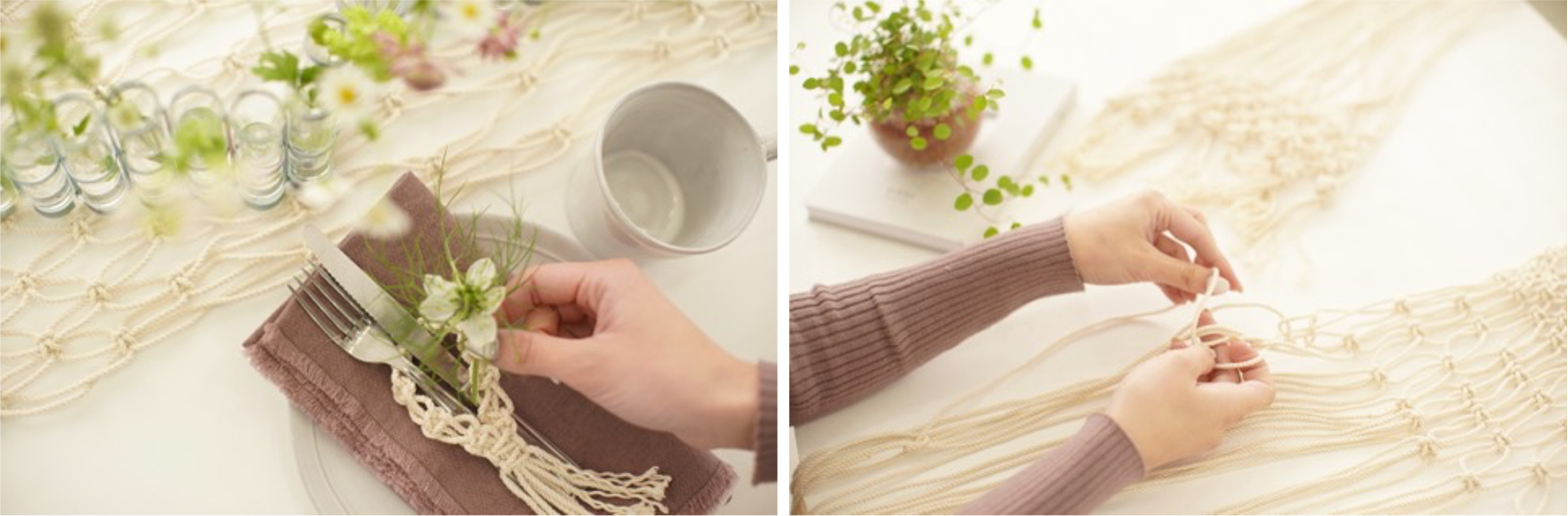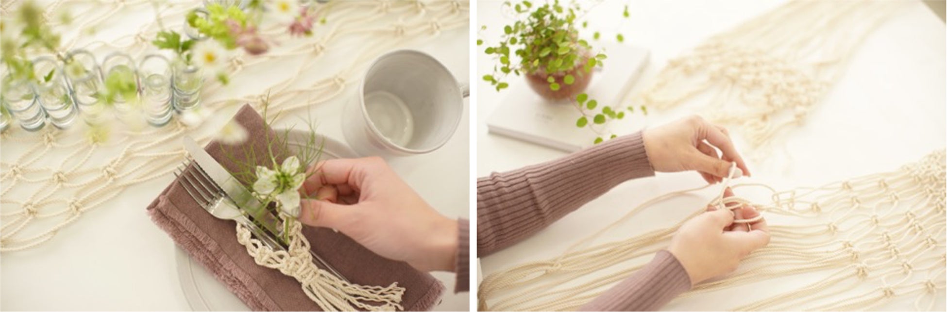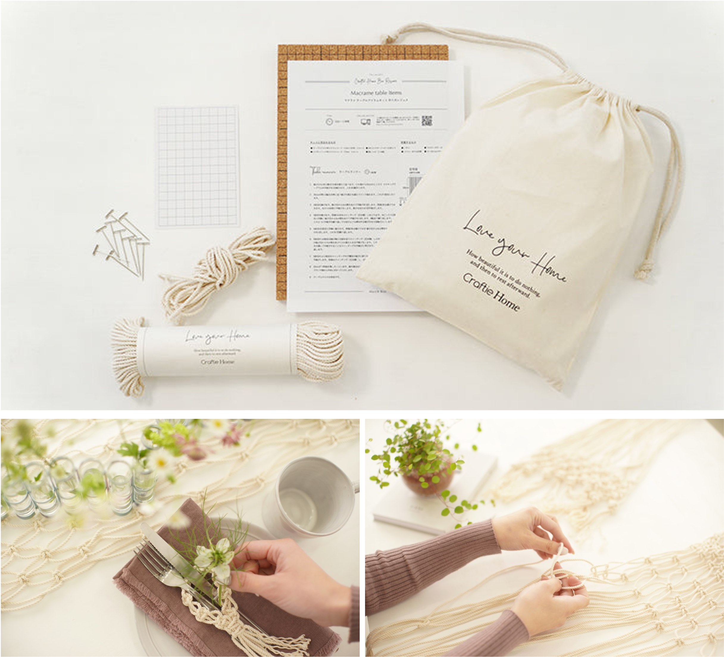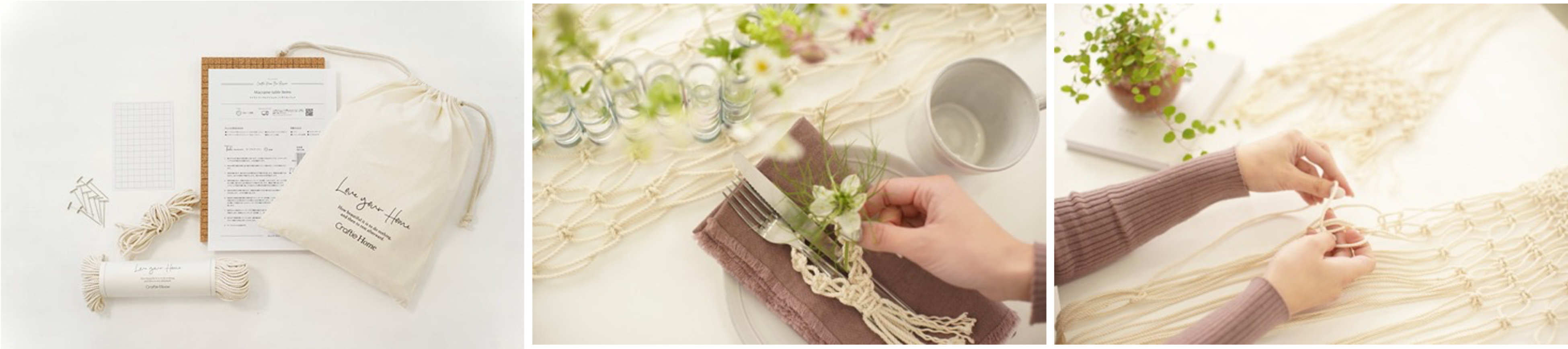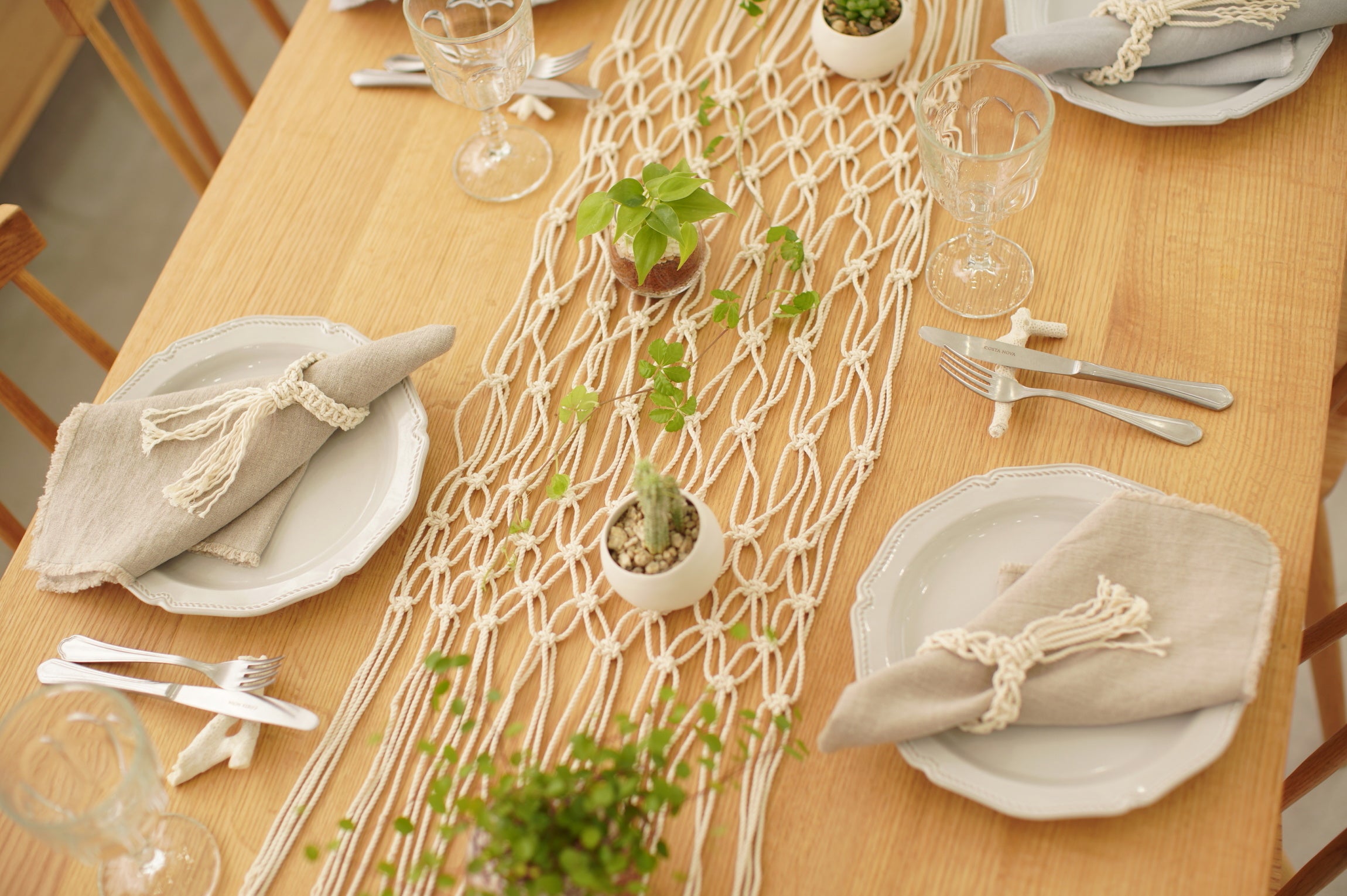 ひもを結ぶだけでおしゃれな模様が作れるマクラメは、BOHOスタイルや韓国インテリアのキーアイテムとして人気急上昇。Craftie Homeが4月にお届けするのは、そんなトレンド感あふれるマクラメのテーブルランナーとナプキンリングです。