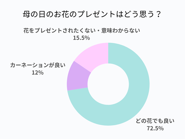 一方で、母の日に受け取るお花は「どの種類の花でもいい」と72.5%の回答者が回答しており、カーネーションを好むと答えたのは12%のみです。(上図)