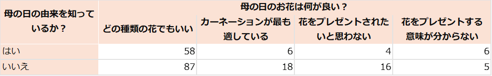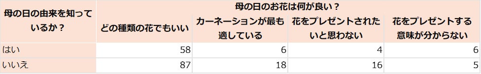 カーネーションの由来を知っている人々と知らない人々の間における、母の日の花に対する意見のクロス集計結果(上図)では、カーネーションの由来の知識と母の日の花に対する考え方の間には強い相関は見られません。