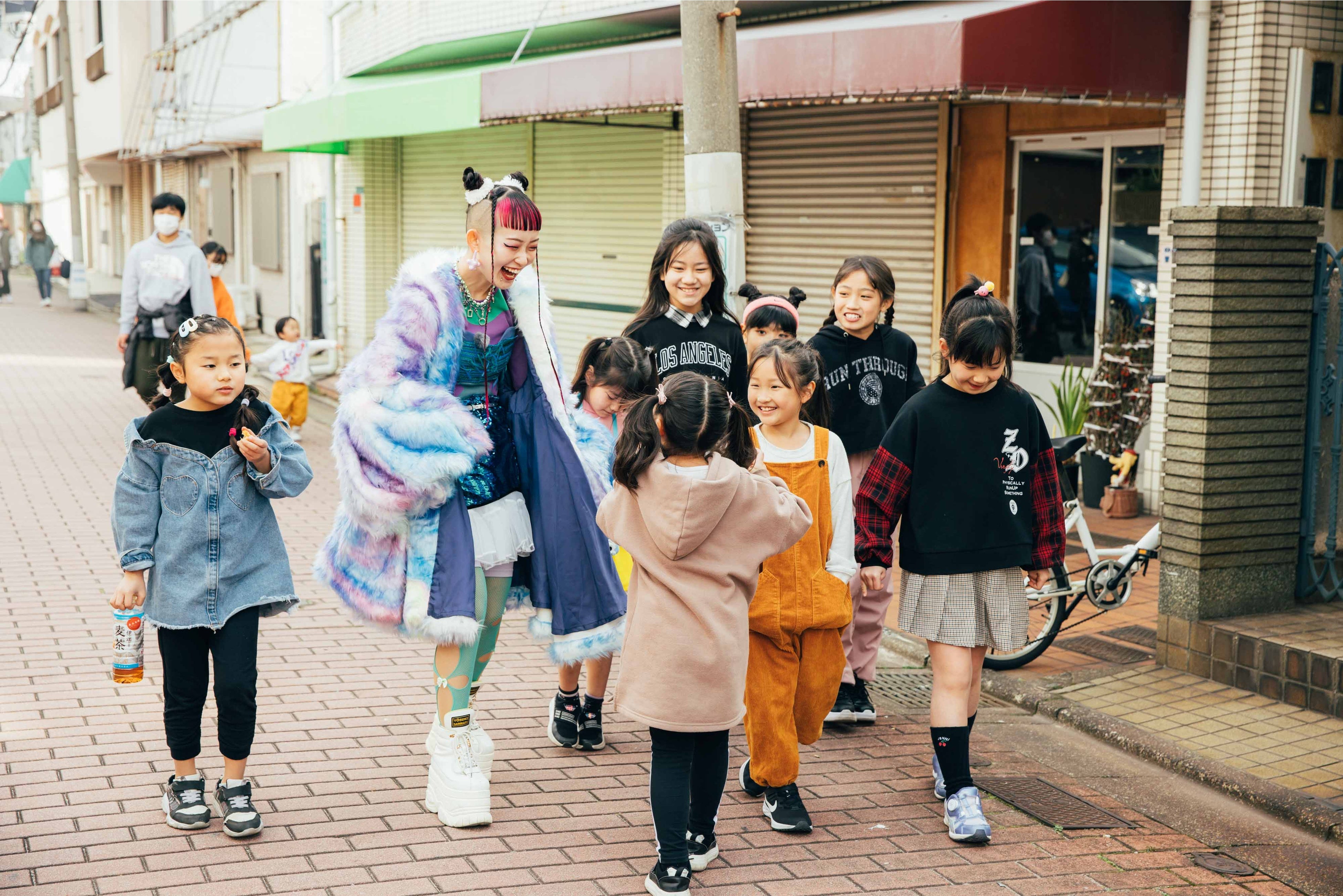 再び若松に訪れた水曜日のカンパネラ・詩羽さんは『RECORD』の舞台となった大正町商店街へ。そこには若松キッズダンサーたちが待ちうけ、そのままキッズたちが直接まち案内をしました。詩羽さんはキッズたちに手を引かれながら、彼らがおすすめするスポットを巡りました。ドキュメンタリー映像には、まちをめぐる様子に加え、その翌日に行われたシンポジウム「若松の日曜日」でお披露目したコラボパフォーマンスのリハーサルなど、裏側から本番までがおさめられています。