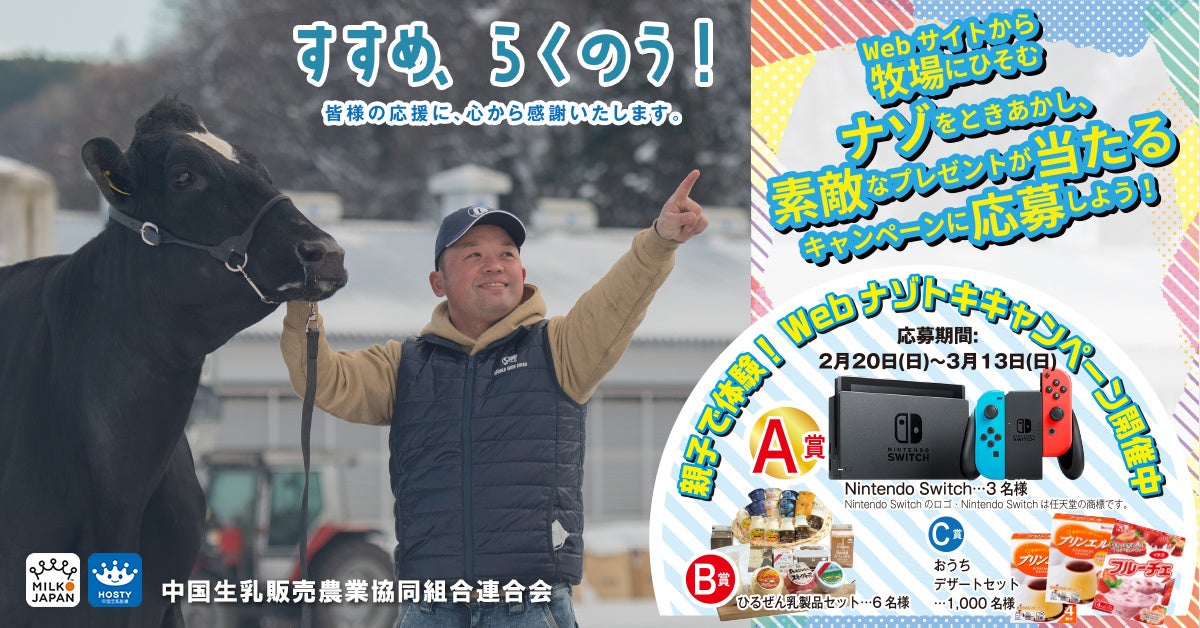 中国生乳販連(所在地:岡山市北区桑田町 代表理事会長:長恒 泰治)では、2022年2月20日(日)から3月13日(日)の期間で、「すすめ、らくのうキャンペーン」と題したWebナゾトキキャンペーンを開催中です。