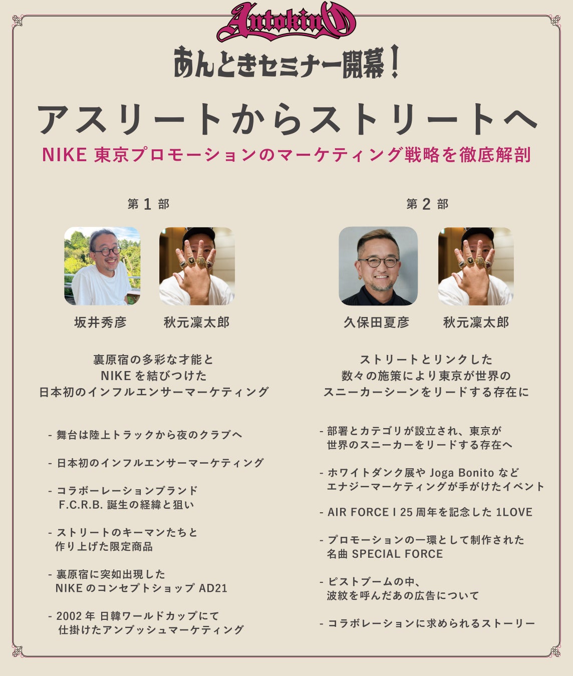 1部と2部に分けて数々の別注モデルの秘話、インフルエンサーマーケティング、AIR FORCE I 25周年記念の限定ショップ、NITRO MICROPHONE UNDERGROUND との楽曲制作など、ストリートカルチャーとリンクしながら実施された数々の施策をマーケティング視点で深掘りしていきます。