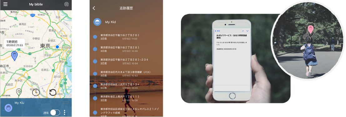 G&Sが開発と販売を行う、アプリと掛け合わせて使用するなくし物防止&見守りタグ「bible(ビブル)」のすれ違いにより更新される位置情報の取得機能と、小田急沿線と周辺施設に設置する受信機の受信機能を活用し、アプリ「biblle」を通じて、専用タグを持つお子さまの現在地を通知メールで親御さまに確認いただけるメール配信サービスです。