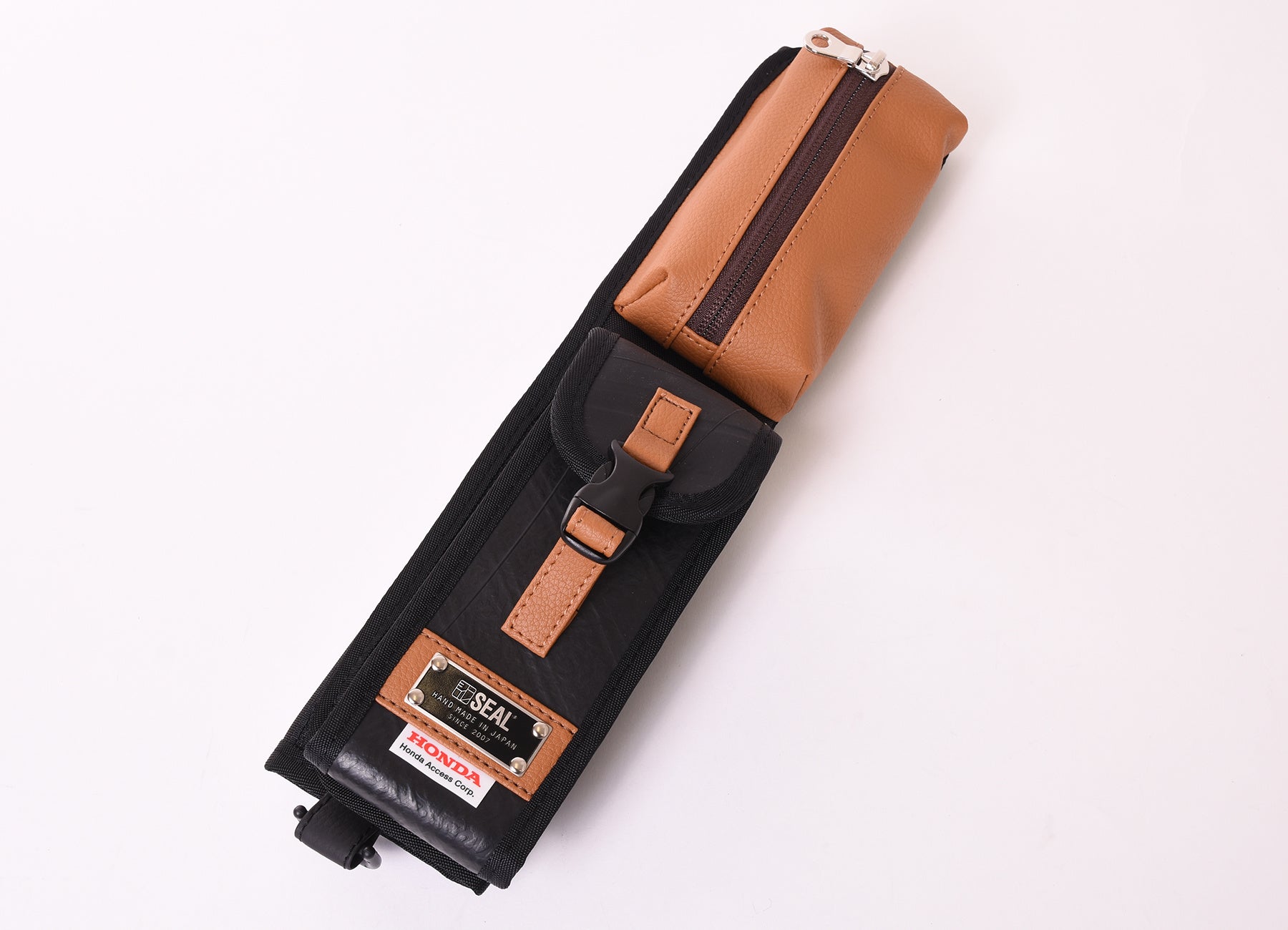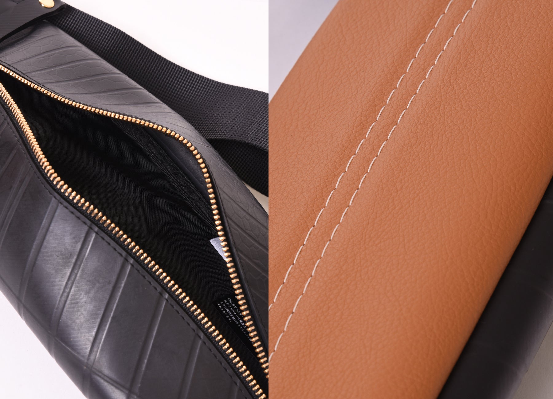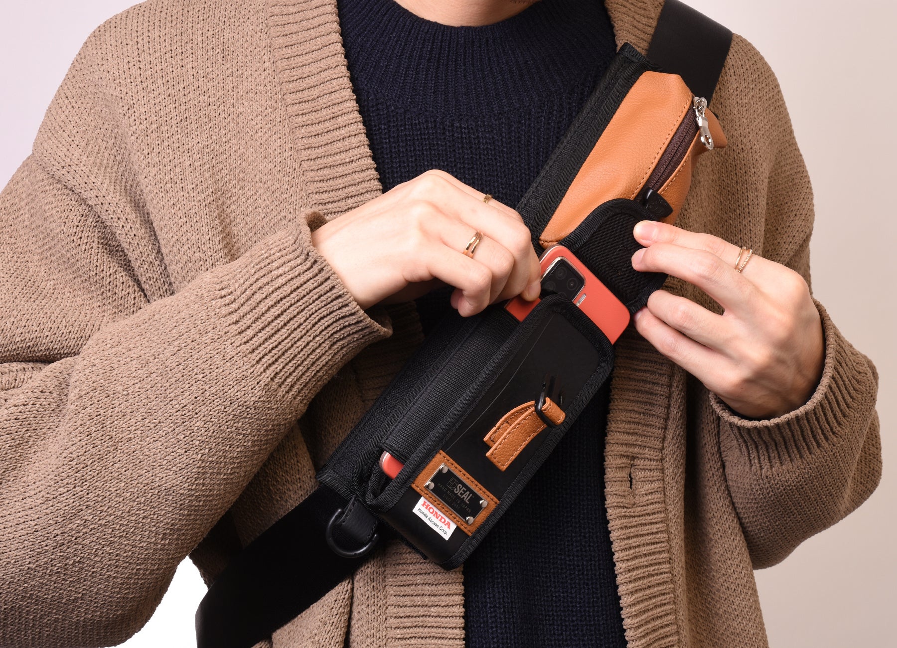 今回のコラボレーションはSEALの大人気アイテム「ショルダーパッド PRO」と「ボディバッグ」の2つをセレクトし、廃タイヤチューブとホンダ車向け純正シートカバーを組み合わせて主要素材にしたアイテムをSEALにてデザイン・開発。車両用シートカバーは長時間座っても疲れにくいクッション性や繰り返し乗降しても傷つきにくい耐久性を兼ね備えるように長年の技術が詰まっているので、この素材の強みを活かし体に触れる部分全面に採用することにより、今回の2つのモデルの疲れにくさと背負い心地の快適さを実現しました。廃タイヤチューブとシートカバーはそのままの色味を反映させてブラックとブラウンを基調とした、大人シックなカラーリングに仕上げました。