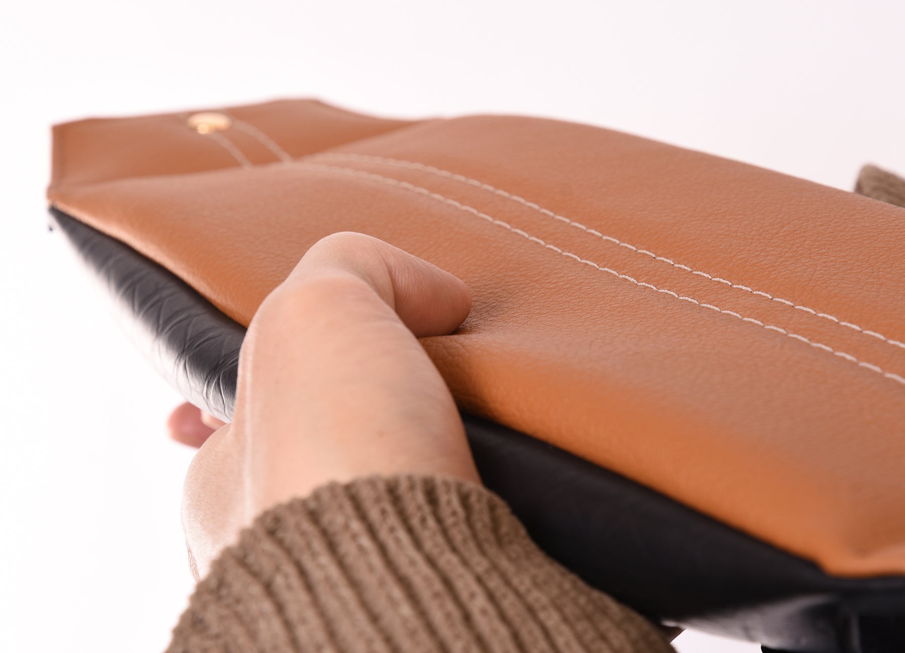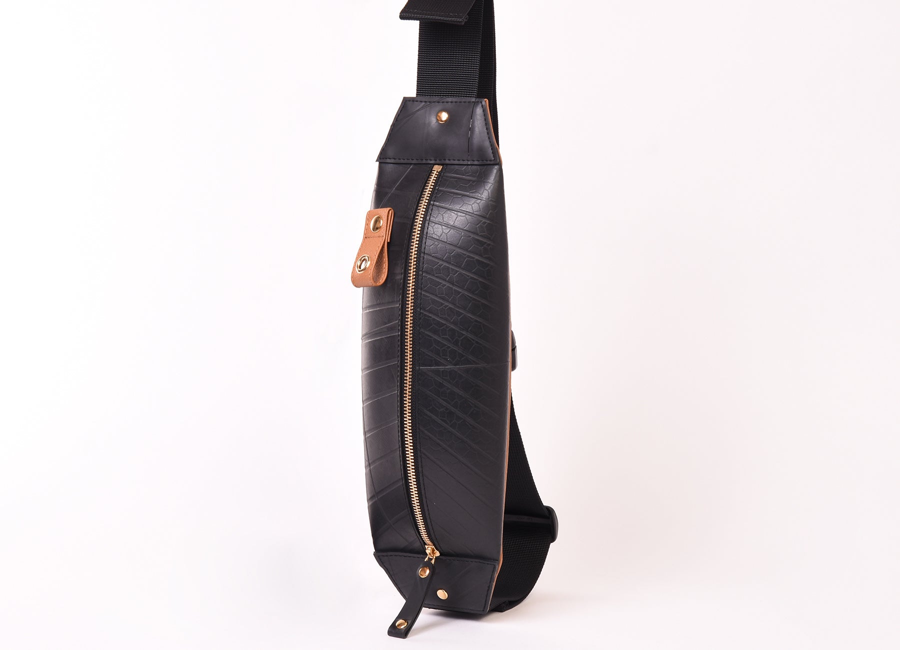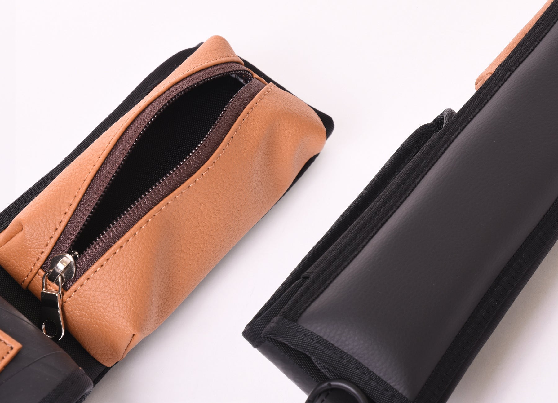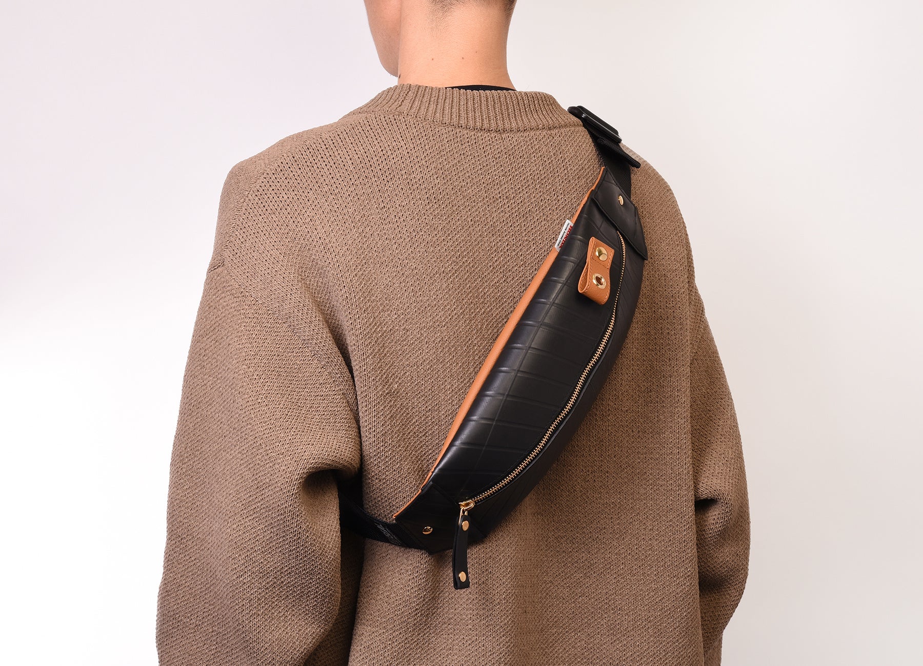 今回のコラボレーションはSEALの大人気アイテム「ショルダーパッド PRO」と「ボディバッグ」の2つをセレクトし、廃タイヤチューブとホンダ車向け純正シートカバーを組み合わせて主要素材にしたアイテムをSEALにてデザイン・開発。車両用シートカバーは長時間座っても疲れにくいクッション性や繰り返し乗降しても傷つきにくい耐久性を兼ね備えるように長年の技術が詰まっているので、この素材の強みを活かし体に触れる部分全面に採用することにより、今回の2つのモデルの疲れにくさと背負い心地の快適さを実現しました。廃タイヤチューブとシートカバーはそのままの色味を反映させてブラックとブラウンを基調とした、大人シックなカラーリングに仕上げました。