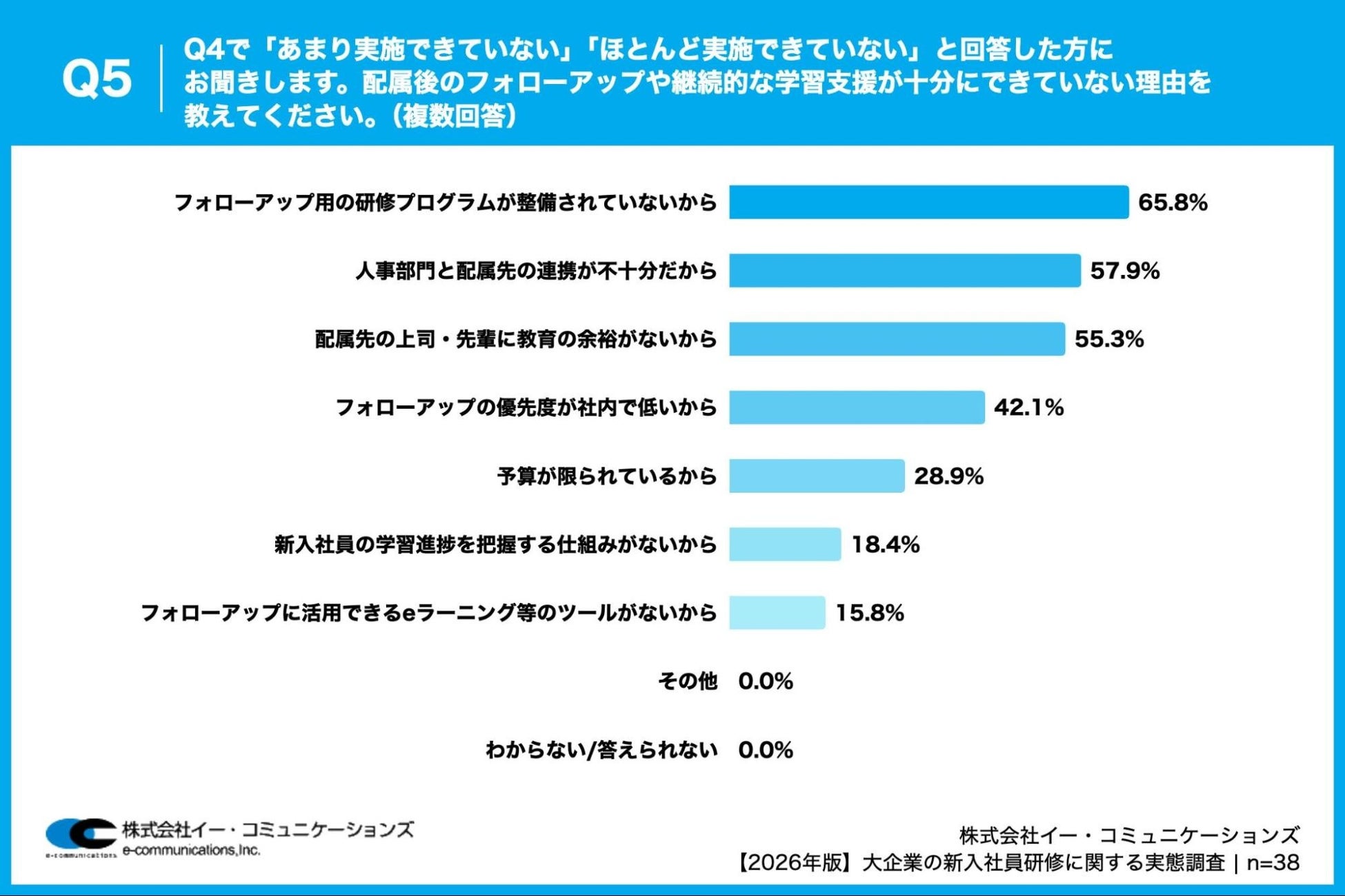 「Q5. Q4で「あまり実施できていない」「ほとんど実施できていない」と回答した方にお聞きします。配属後のフォローアップや継続的な学習支援が十分にできていない理由を教えてください。(複数回答)」(n=38)と質問したところ、「フォローアップ用の研修プログラムが整備されていないから」が65.8%、「人事部門と配属先の連携が不十分だから」が57.9%、「配属先の上司・先輩に教育の余裕がないから」が55.3%という回答となりました。