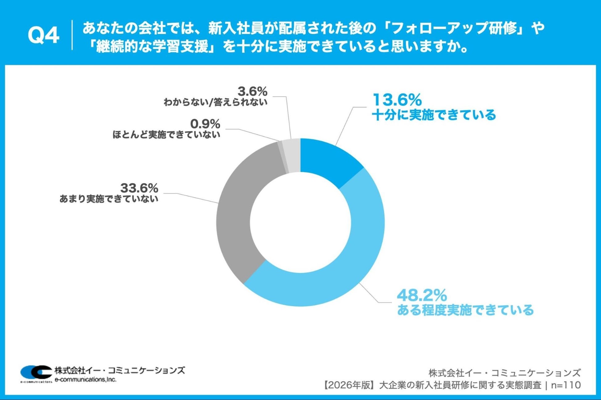 「Q4. あなたの会社では、新入社員が配属された後の「フォローアップ研修」や「継続的な学習支援」を十分に実施できていると思いますか。」(n=110)と質問したところ、「ある程度実施できている」が48.2%、「あまり実施できていない」が33.6%という回答となりました。
