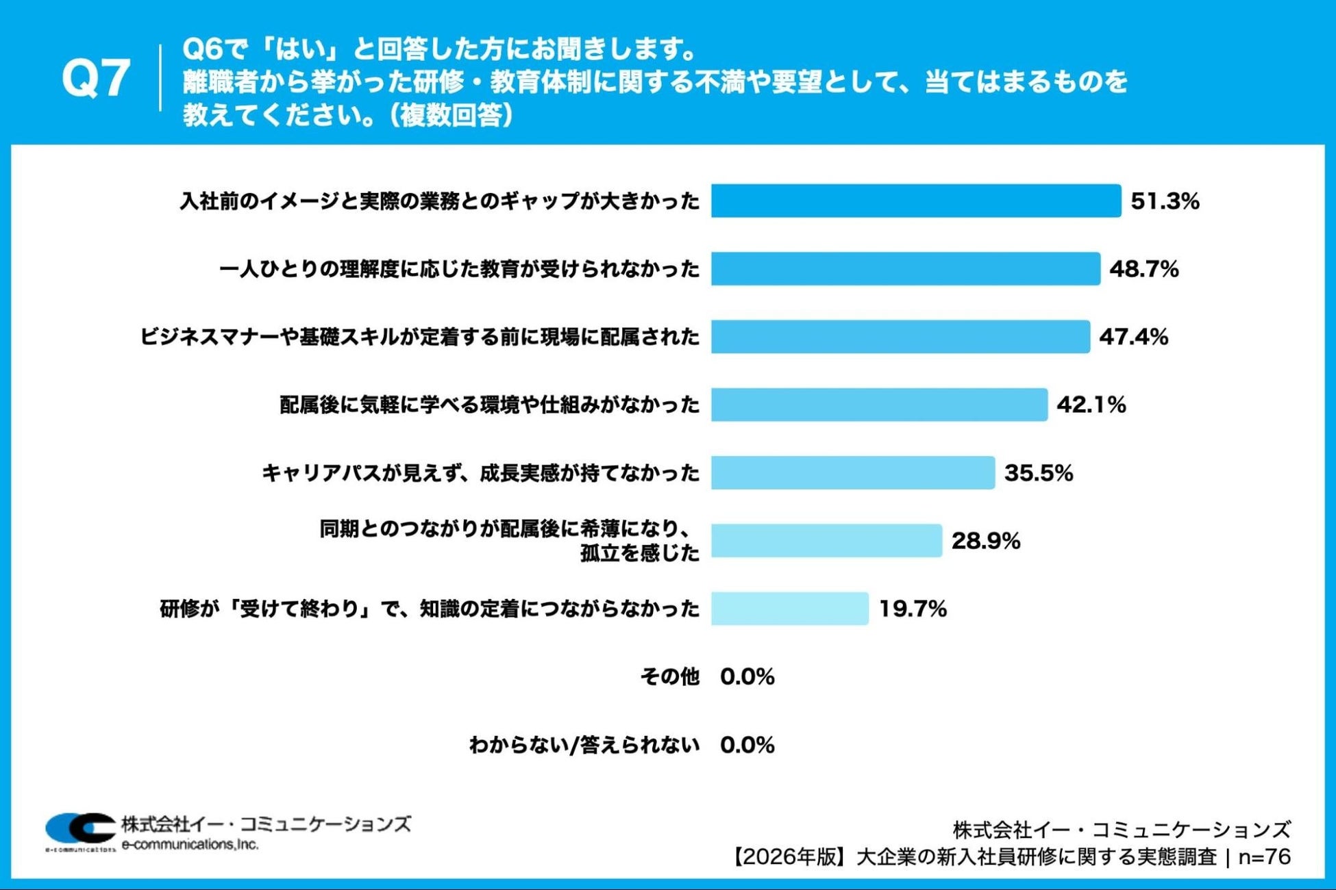 「Q7. Q6で「はい」と回答した方にお聞きします。離職者から挙がった研修・教育体制に関する不満や要望として、当てはまるものを教えてください。(複数回答)」(n=76)と質問したところ、「入社前のイメージと実際の業務とのギャップが大きかった」が51.3%、「一人ひとりの理解度に応じた教育が受けられなかった」が48.7%、「ビジネスマナーや基礎スキルが定着する前に現場に配属された」が47.4%という回答となりました。