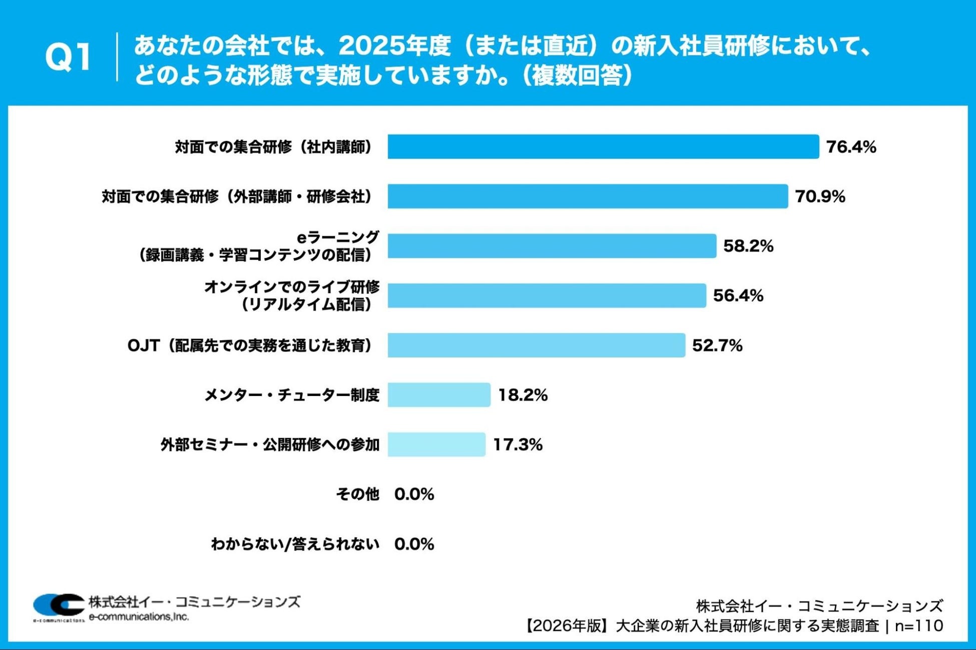 「Q1. あなたの会社では、2025年度(または直近)の新入社員研修において、どのような形態で実施していますか。(複数回答)」(n=110)と質問したところ、「対面での集合研修(社内講師)」が76.4%、「対面での集合研修(外部講師・研修会社)」が70.9%、「eラーニング(録画講義・学習コンテンツの配信)」が58.2%という回答となりました。