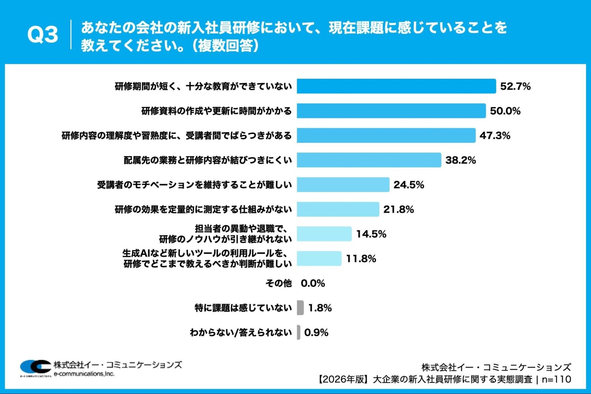 「Q3. あなたの会社の新入社員研修において、現在課題に感じていることを教えてください。(複数回答)」(n=110)と質問したところ、「研修期間が短く、十分な教育ができていない」が52.7%、「研修資料の作成や更新に時間がかかる」が50.0%、「研修内容の理解度や習熟度に、受講者間でばらつきがある」が47.3%という回答となりました。