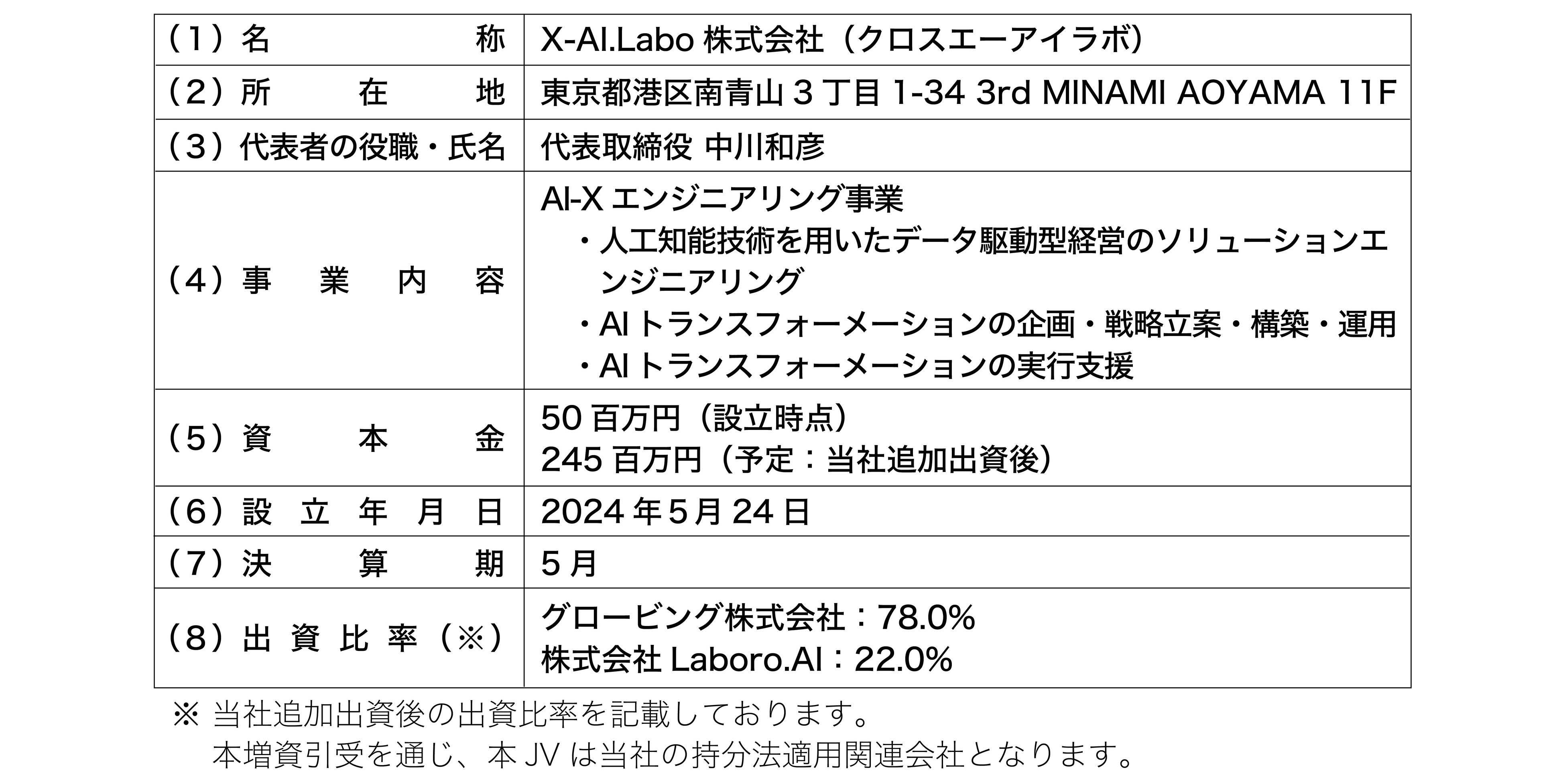 AI/データを核とした既存事業・新規事業の再構築と持続的な成長を実現するためのトランスフォーメーション、すなわち「AIトランスフォーメーション(以下、AI-X)」によって企業の競争力を極限まで高めることの必要性は高くなっております。今般、カスタムAIの開発・ビジネス実装・コンサルティング領域でノウハウを保有する当社と、戦略×DXにおけるハンズオンサポートを通じた経営変革や革新的なDXの実行・実現、成果創出などに強みを持つグロービングが協働することで、クライアント企業に対しAI-Xの企画・戦略立案・推進のためのソリューションを提供することが可能と判断し、本JVの設立に向けた合弁契約を締結することといたしました。