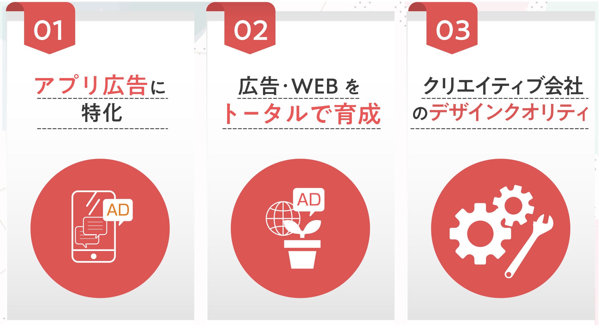 従来型の広告戦略に加えて、制作プロとして培ってきたクリエイティブのチカラで、広告と着地先であるWEB/アプリページの親和性を高める提案を行うことで、広告効果を高め続ける(育成していく)サービスです。
