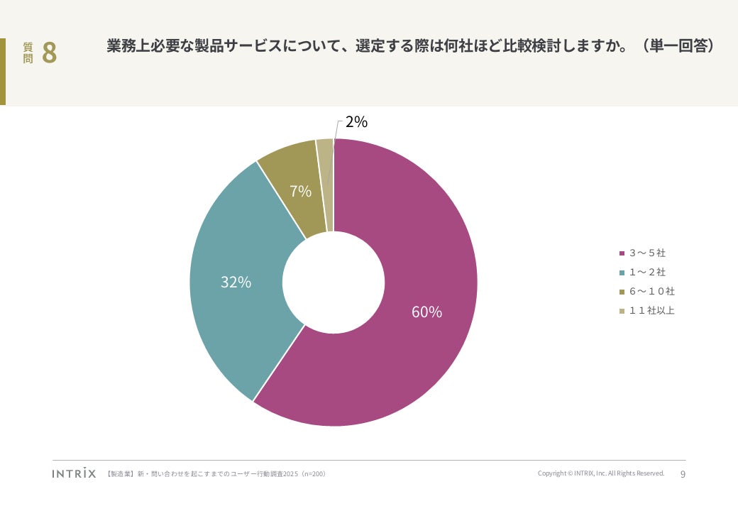 質問8では、「業務上必要な製品サービスについて、選定する際は何社ほど比較検討しますか」。と伺いました。最も多かった回答は「3~5社」で60%。以下、「1~2社」が32%、「6~10社」が7%。「11社以上」と回答した方は2%にとどまりました。製品やサービスを提供する立場から見ると、まず回答の9割以上を占める「5社以下」に入ることが必要となります。