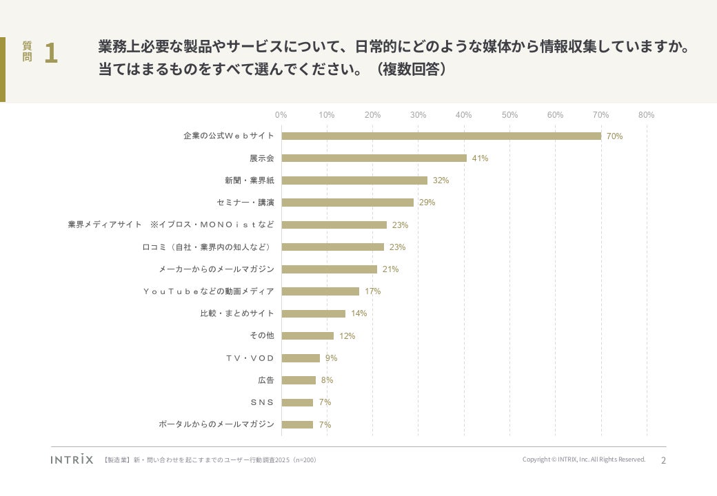 質問1では、業務上必要な製品やサービスについて、日常的にどのような媒体から情報収集しているかを伺いました。1位は70%の方に選ばれた「企業の公式Webサイト」で、2位の「展示会」の41%を大きく引き離す結果となりました(複数回答可)。そのほかの媒体としては「新聞・業界紙」「セミナー・講演」「業界メディアサイト」「口コミ」などを選んだ方が多く、さまざまな媒体から情報を収集していることがうかがえました。
