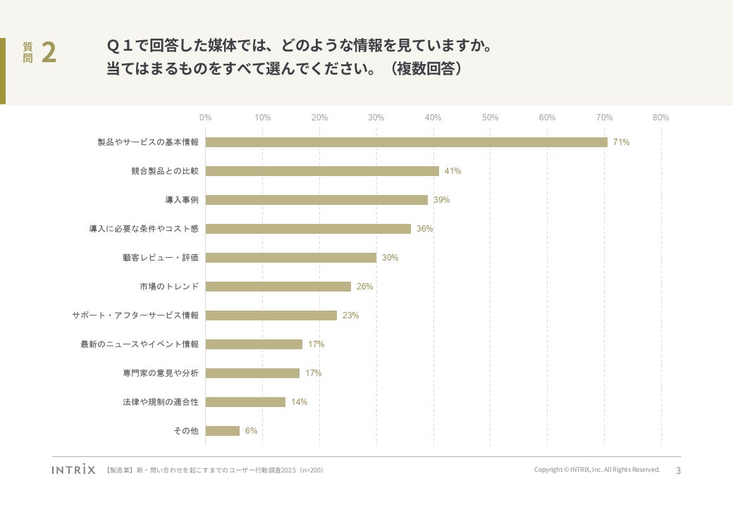 質問2では、「Q1で回答した媒体では、どのような情報を見ていますか」をうかがいました(複数回答)。もっとも多かった回答は「製品やサービスの基本情報」で、71%。続いて「競合製品との比較」(41%)、「導入事例」(39%)、「導入に必要な条件やコスト感」(36%)。「顧客レビュー・評価」(30%)が挙がり、製造業の製品選定・購買プロセスでは、多面的に情報を収集して比較検討を行っていることがわかりました。
