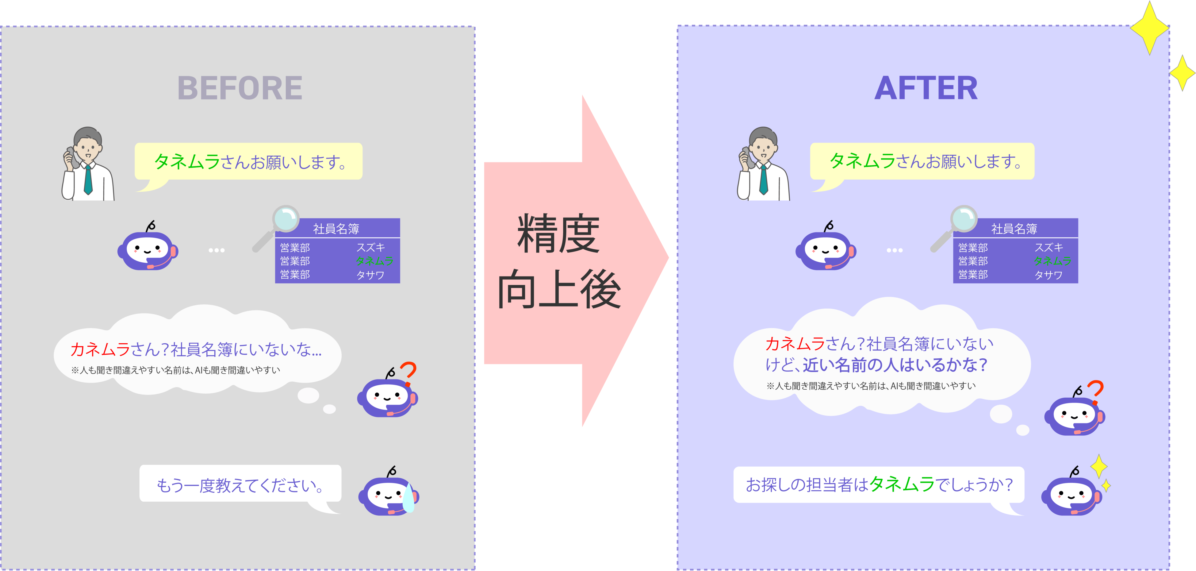 そのため、一文字でも認識した担当者名に相違があった場合、なかなか担当者に取り次ぐことができず、お電話をいただいたお客様のストレスとなっておりました。今回の精度向上では、ヒアリングで認識した担当者名と社員名簿に一致する担当者がいなかった場合でも、近しい担当者名があった場合は、お客様に確認し取り次ぎを行います。