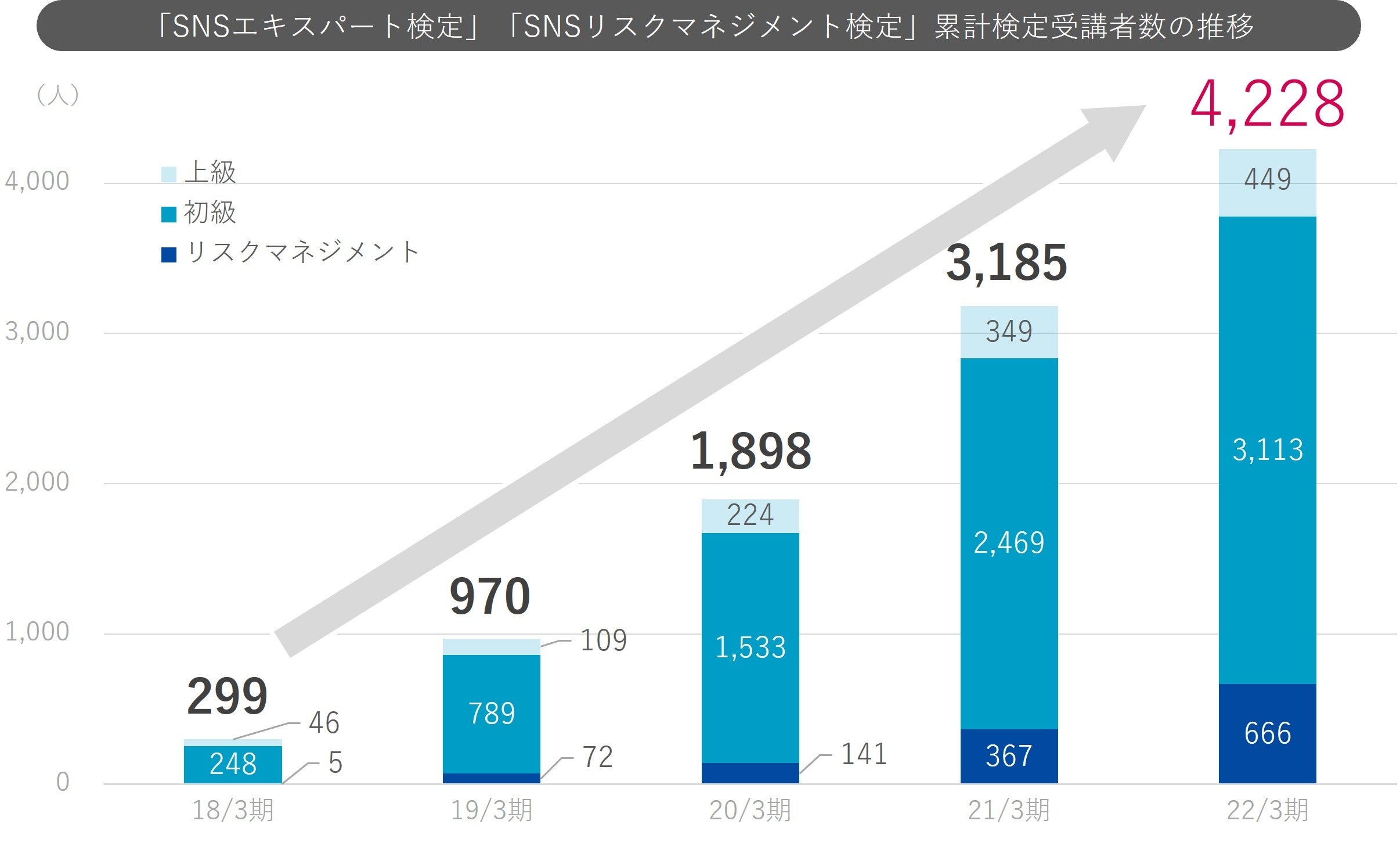 累計検定受講者数、「SNSエキスパート検定(初級・上級)」は前年比126%、「SNSリスクマネジメント検定」は181%に