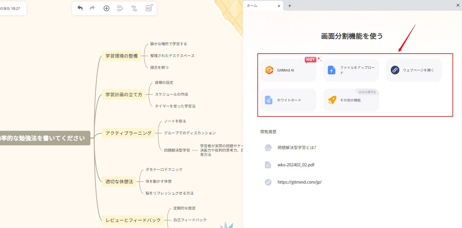 ■ 柔軟なデータ統合:画面分割モードでは、マインドマップを作成しながらウェブページ、ドキュメント、GitMind Chatやホワイトボードの内容を閲覧することができます。 この操作方法は、マインドマップに豊富な内容を追加するだけでなく、全体的な作業効率と品質を向上させます。