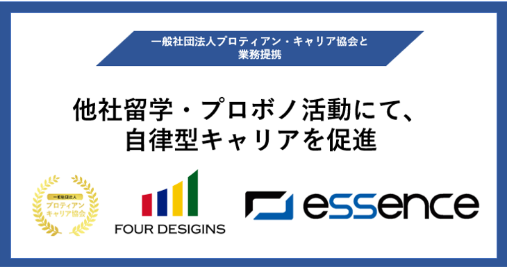 エッセンス株式会社(東京都中 央区、代表取締役:⽶⽥ 瑛紀、以下「エッセンス」)の他社留学、プロボノプログラムは、組織と個⼈のより良い関係構築と個⼈の主体的なキャリア開発を⽀援する団体を運営する⼀般社団法⼈プロティアン・キャリア協会(東京都新宿区、代表理事:⽥中研之輔・有⼭徹)との連携を⽬的 に、業務提携を開始したことをお知らせします。他業界・異業種で⾃分が培ってきたスキルを活かす他社 留学、プロボノ活動を通して、変化に強い⾃律したキャリア形成を促進します。