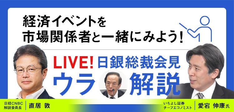 「LIVE!日銀総裁会見『ウラ解説』」第2回を配信!日銀の植田総裁による会見を、いちよし証券の愛宕伸康氏と日経CNBCの直居敦がリアルタイム解説