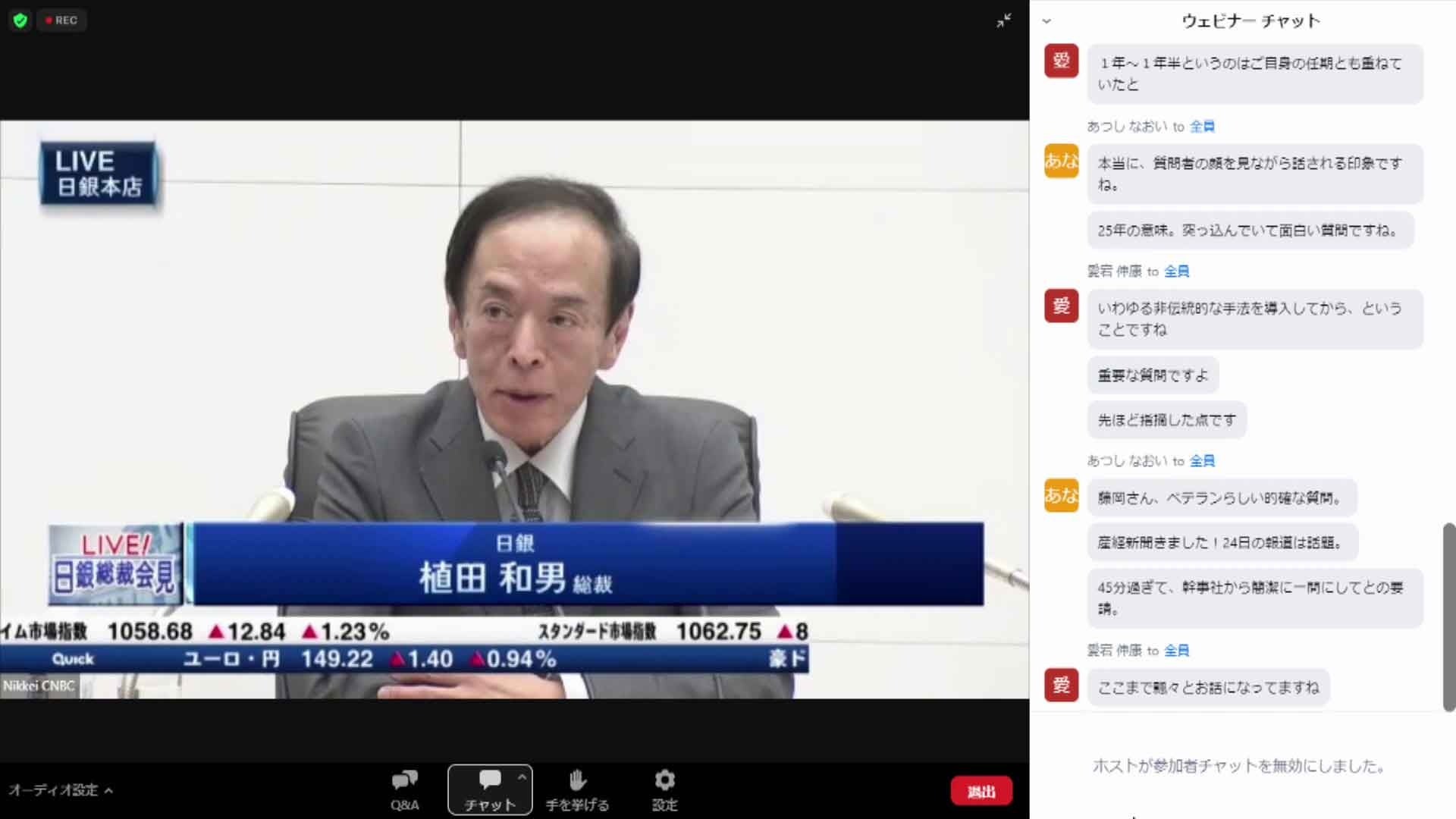 開催当日の15:20からプレトークを行い、総裁会見が始まる15:30から会見終了まで、Zoomのチャット機能を使ってリアルタイムで解説します。同時に配信する植田新総裁の映像を視聴しながら、専門家の解説を文字情報で確認することができます。