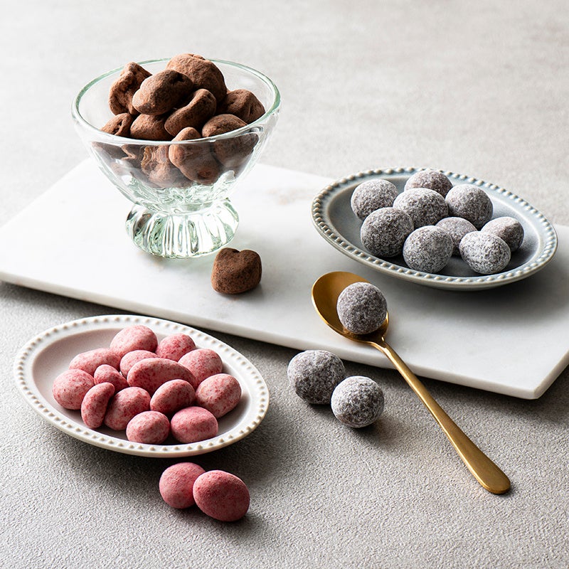キャラメリゼした大粒のナッツや、洋酒漬けされたドライフルーツを、上質なチョコレートでコーティング。お酒とのマリアージュも楽しめる、大人のためのチョコレートドラジェです。