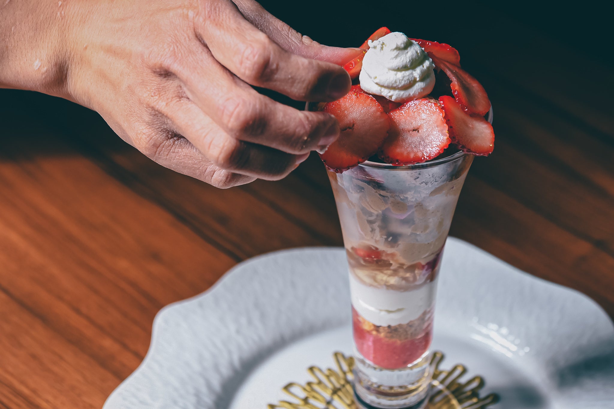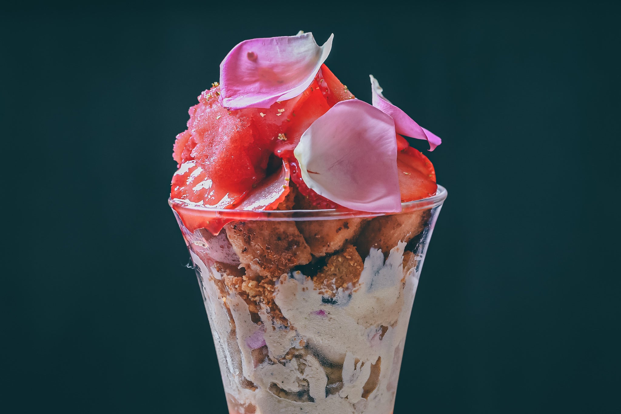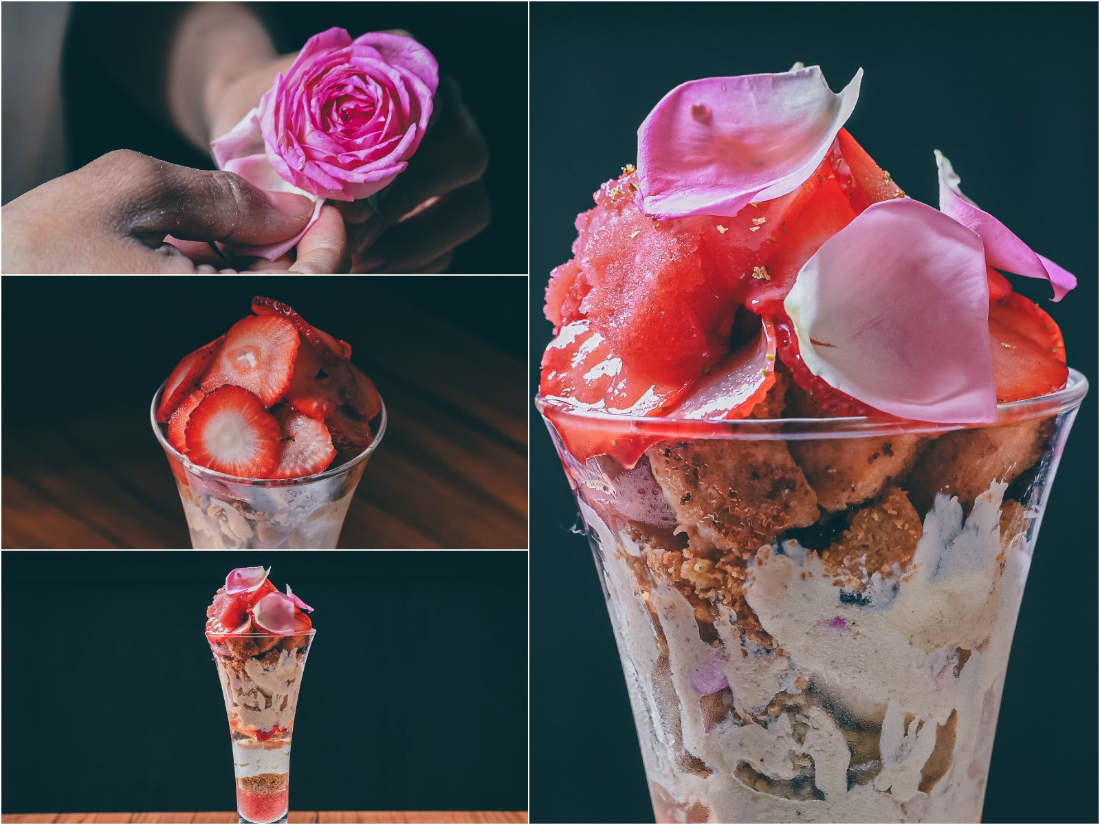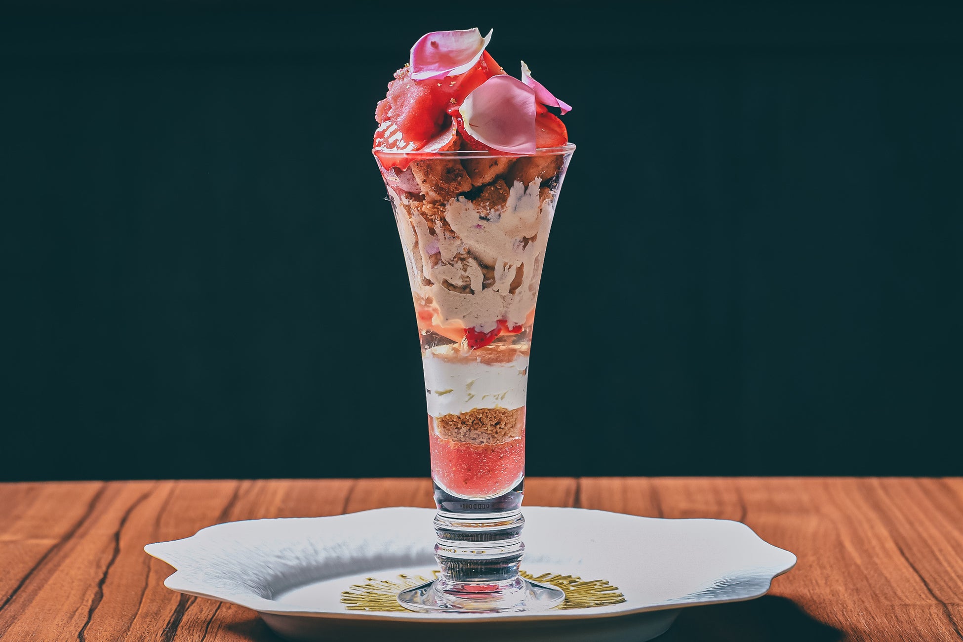 - 薔薇香る和紅茶のアイスクリームの上にはアツアツの苺のパンペルデュ。フレッシュの苺と香り高い薔薇をあしらったアツアツ、冷たいパフェ。