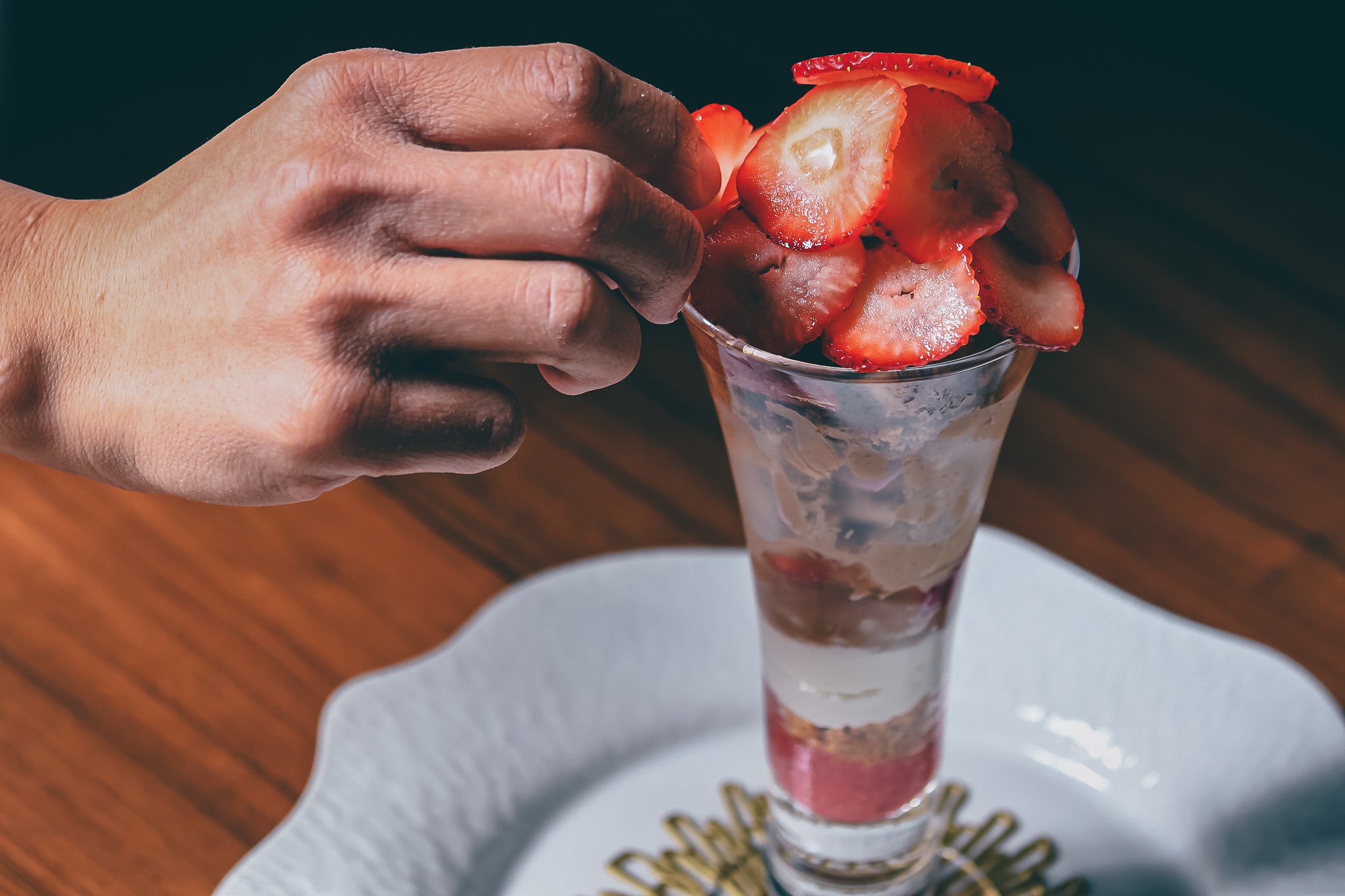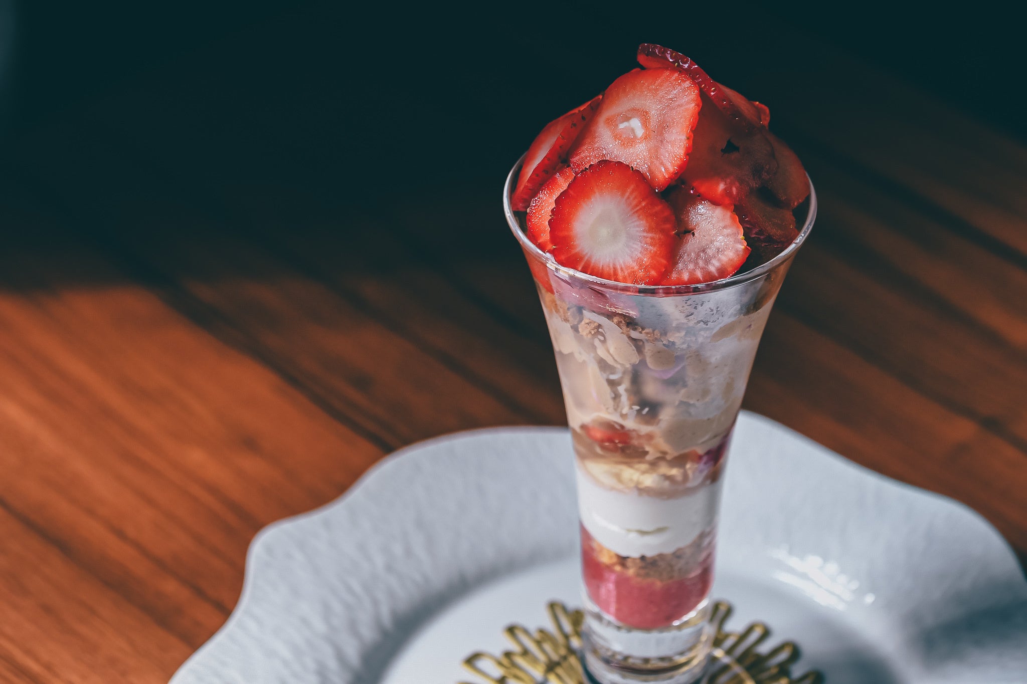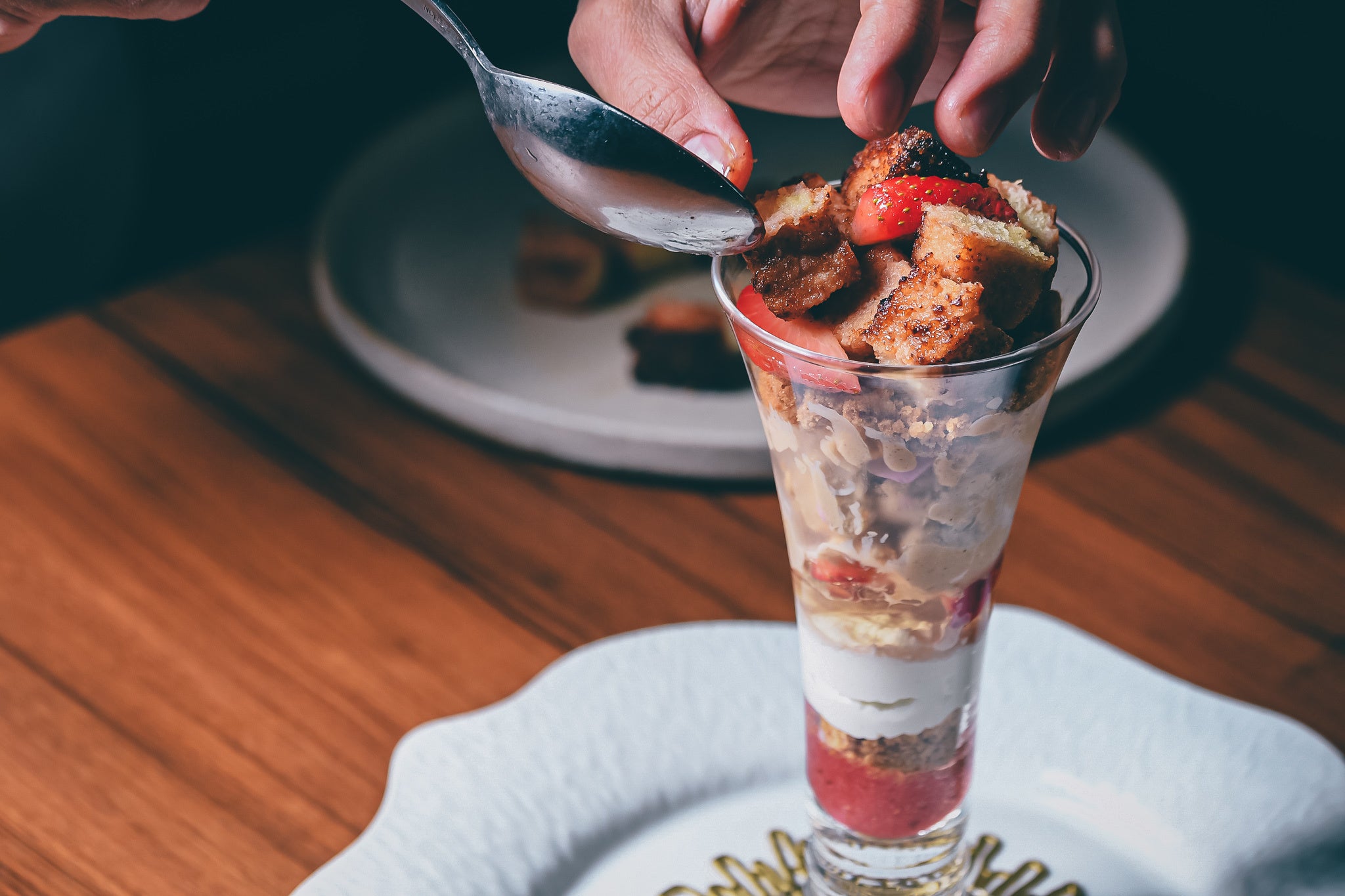 - 薔薇香る和紅茶のアイスクリームの上にはアツアツの苺のパンペルデュ。フレッシュの苺と香り高い薔薇をあしらったアツアツ、冷たいパフェ。