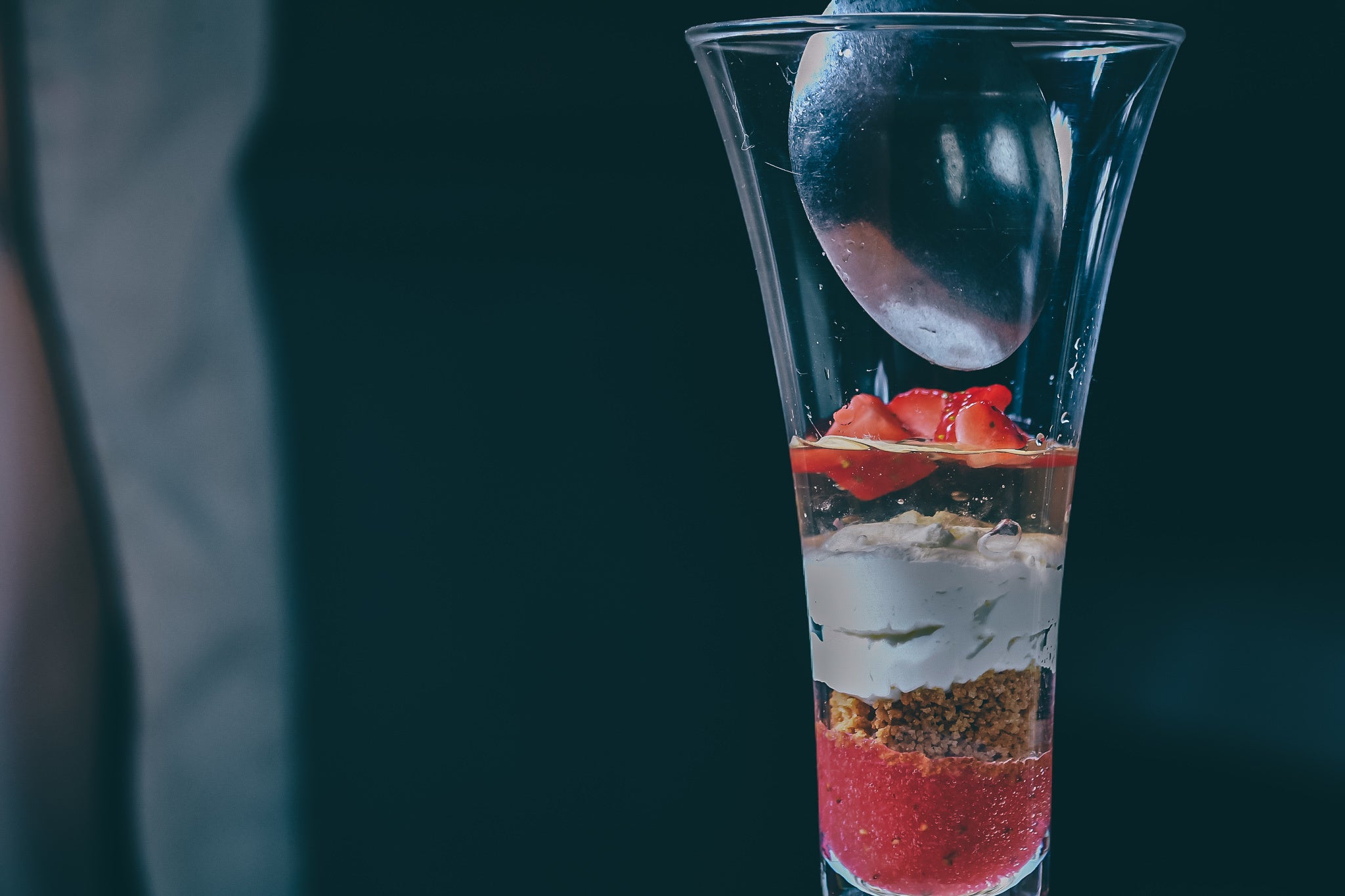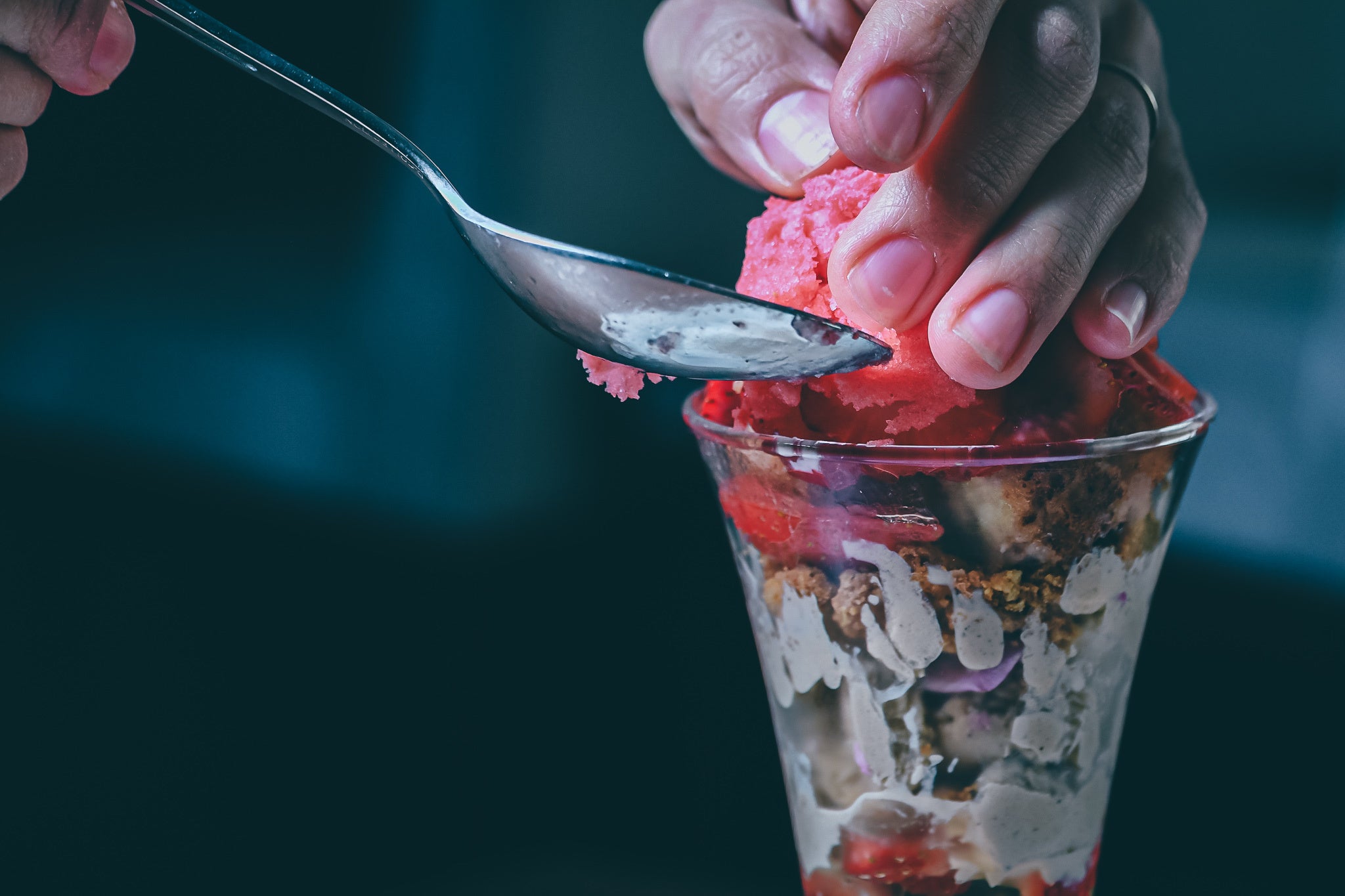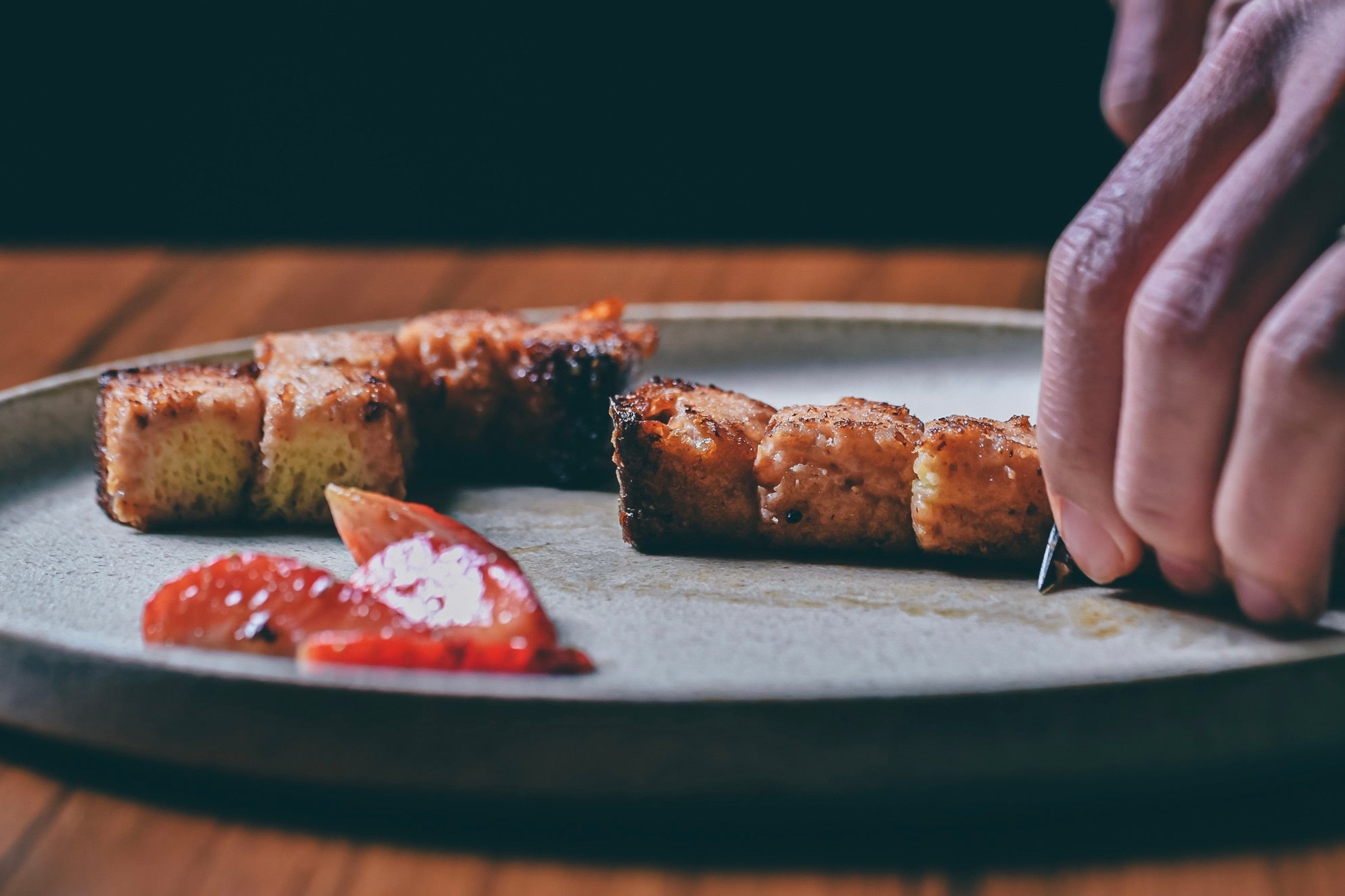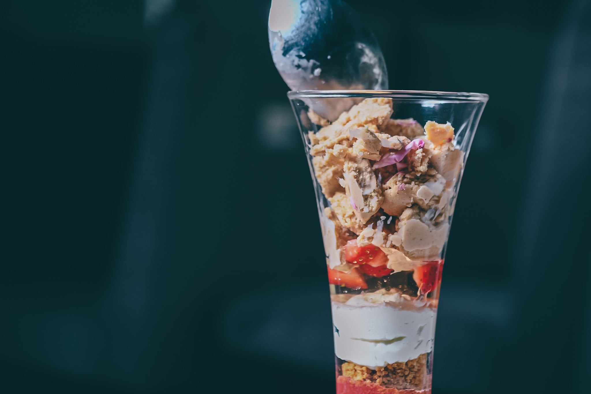 - 薔薇香る和紅茶のアイスクリームの上にはアツアツの苺のパンペルデュ。フレッシュの苺と香り高い薔薇をあしらったアツアツ、冷たいパフェ。