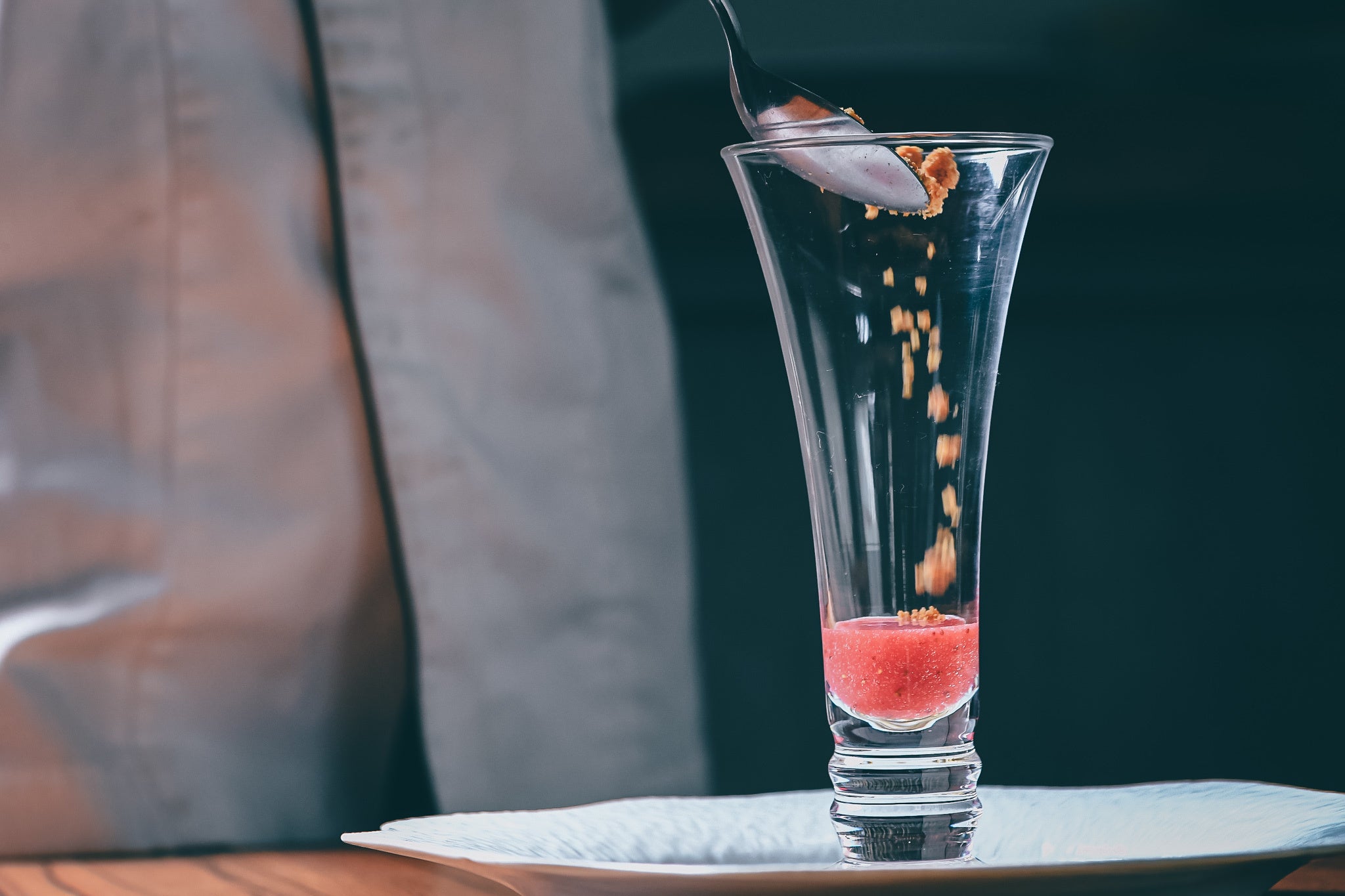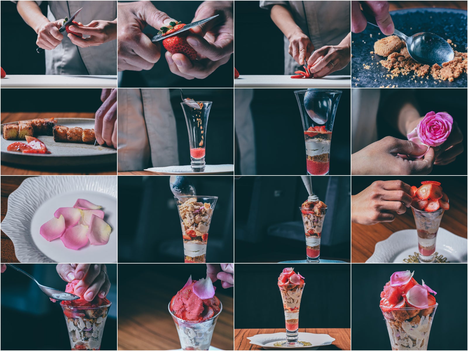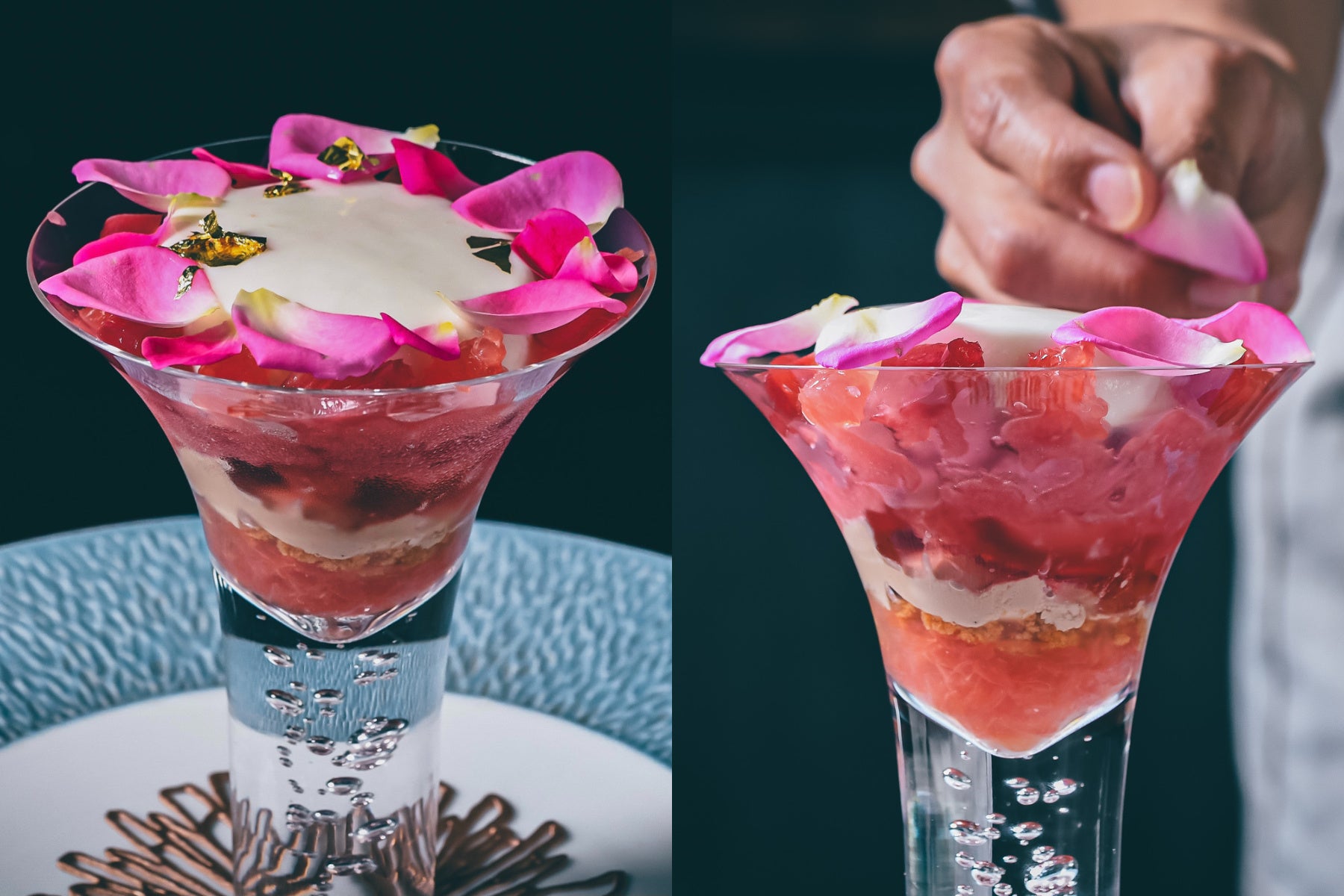 食用バラの香りと味を最大限に生かすために、バラとの相性を計算し尽くされた構成が特徴です。その構成は、ピンクグレープフルーツのソース、クランブル、和紅茶のクレームブリュレ、カンパリのジュレ、ルバーブのソルベ、薔薇のブランマンジェ、そして、そのまわりにルバーブのコンポートやピンクグレープフルーツ。上にはバラをあしらいました。
