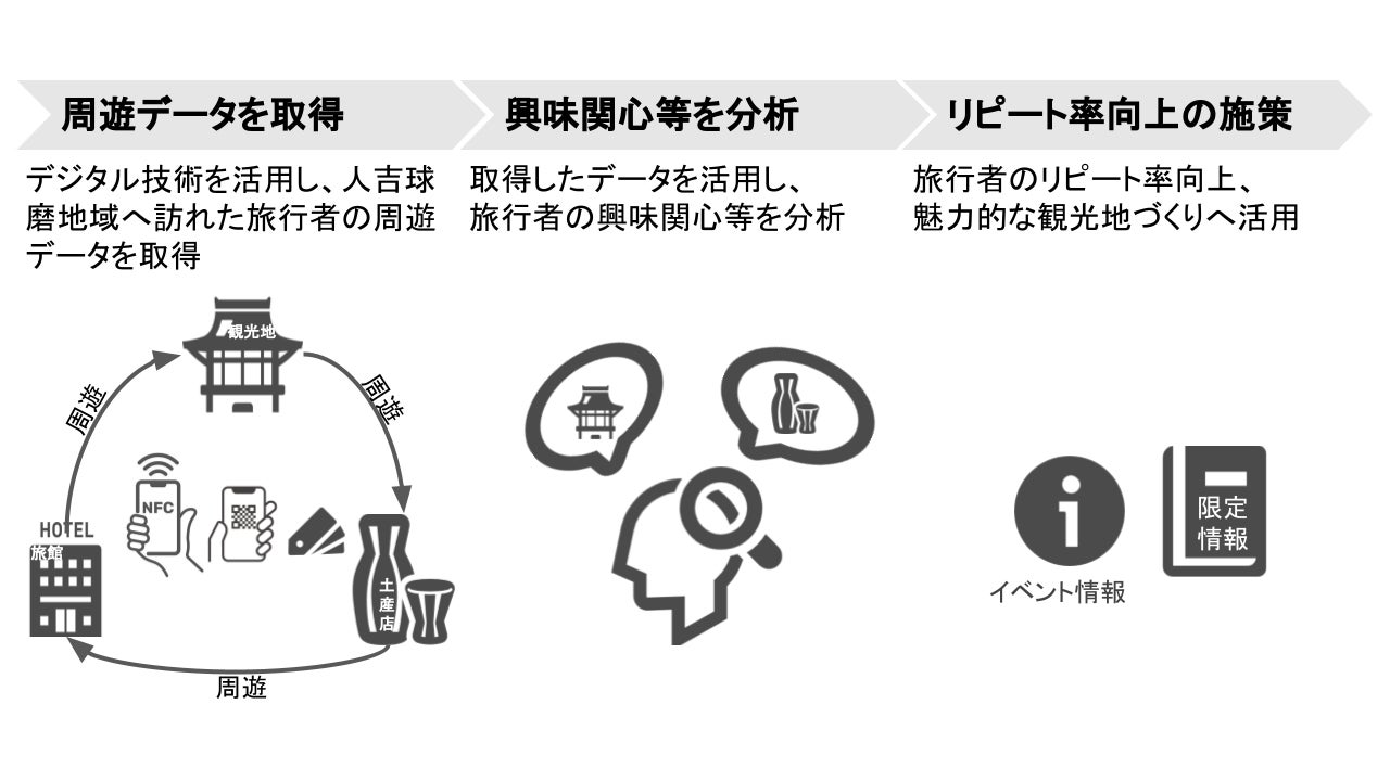 実施概要としては、旅行者が人吉球磨地域の旅館や観光地でデジタル周遊手形を受け取り、訪れた周遊先の足跡を記録し、手形を旅の思い出として持ち帰っていただきます。さらに、蓄積された旅行者の周遊データから個々の興味関心や行動を分析し、リピート率向上に繋げる取り組みを行います。これにより、人吉球磨地域の魅力を多くの人に伝え、人吉球磨ファンを増やすとともに、魅力的で持続可能な観光地へと進化させていきます。