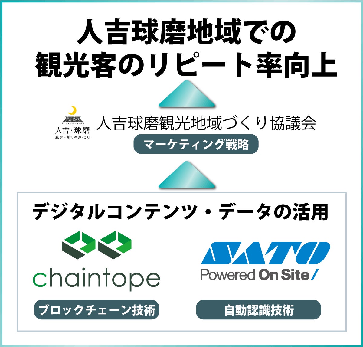 実証事業では、人吉球磨地域のブランド力、Chaintopeのブロックチェーン技術、サトーの自動認識技術を掛け合わせることにより、デジタルコンテンツ・データを活用した人吉球磨地域での観光客のリピート率向上を目指します。