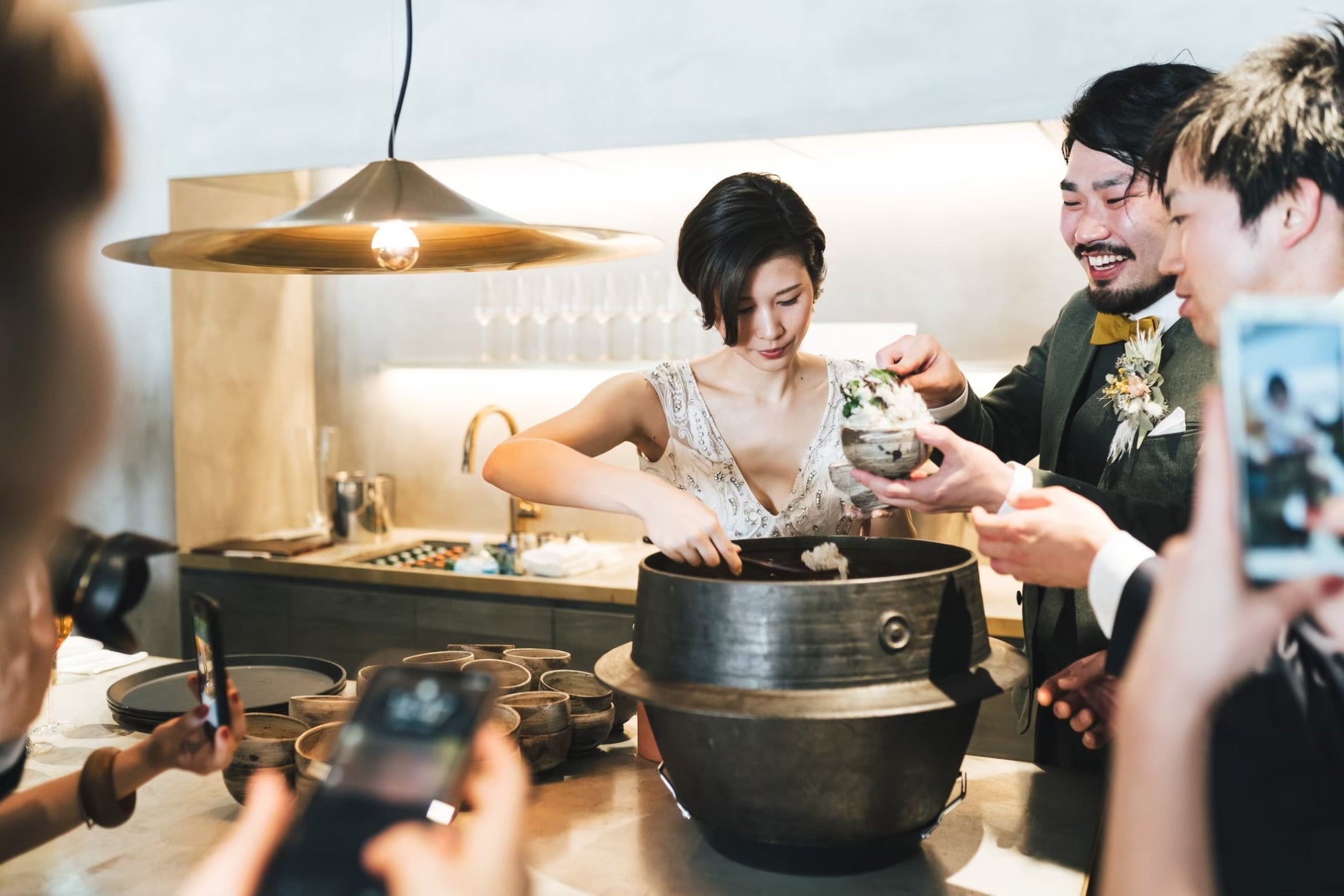 お料理に関しても「同じ釜飯を食う」ということわざになぞらえて、おふたりからゲスト一人ひとりに釜飯を振る舞います。おふたりもゲストもリラックスできる演出で、自然とおふたりとゲストの間に会話が生まれることを大切にしています。
