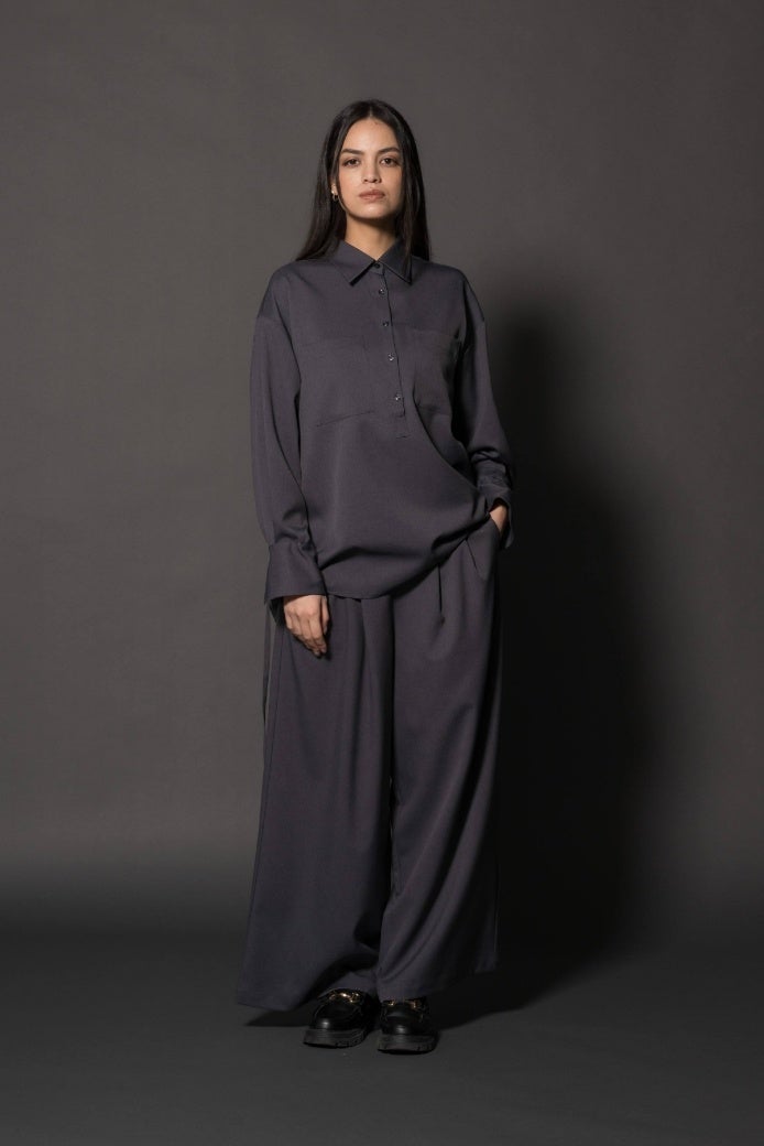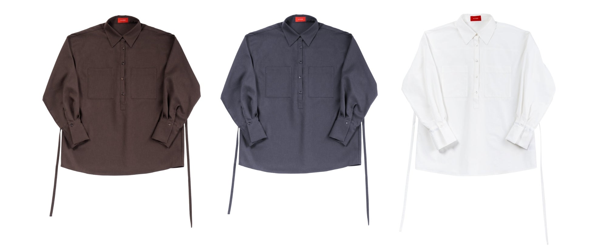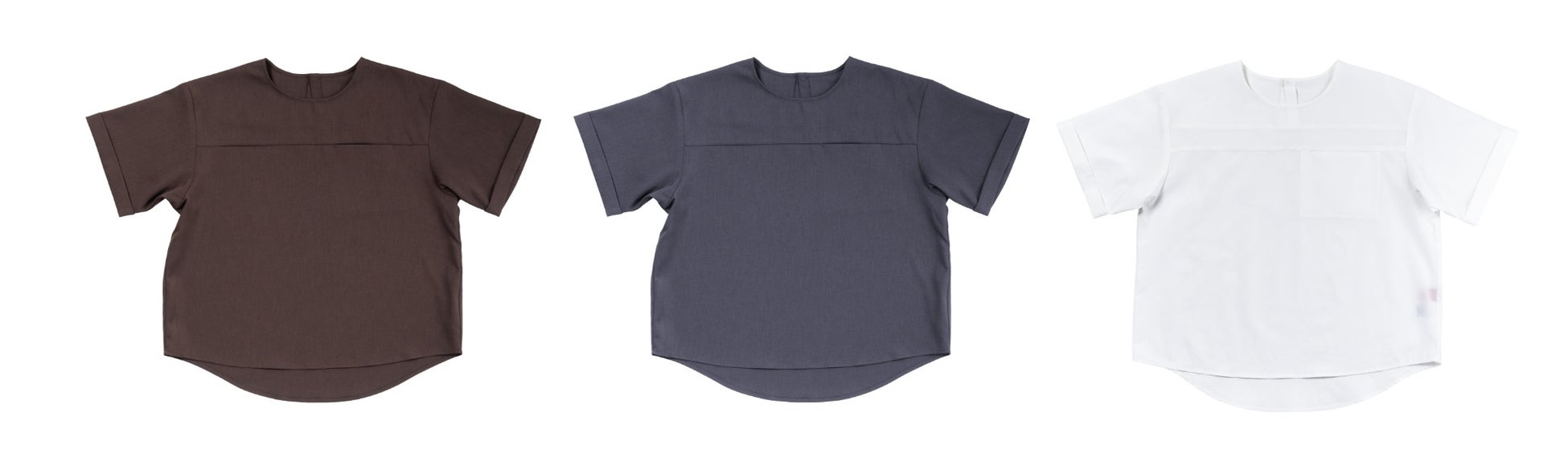 余裕のあるアームと身幅で T シャツ感覚のブラウス。名札のつけやすい左胸シームポケット。後ろスナップボタンでかんたんに着脱。