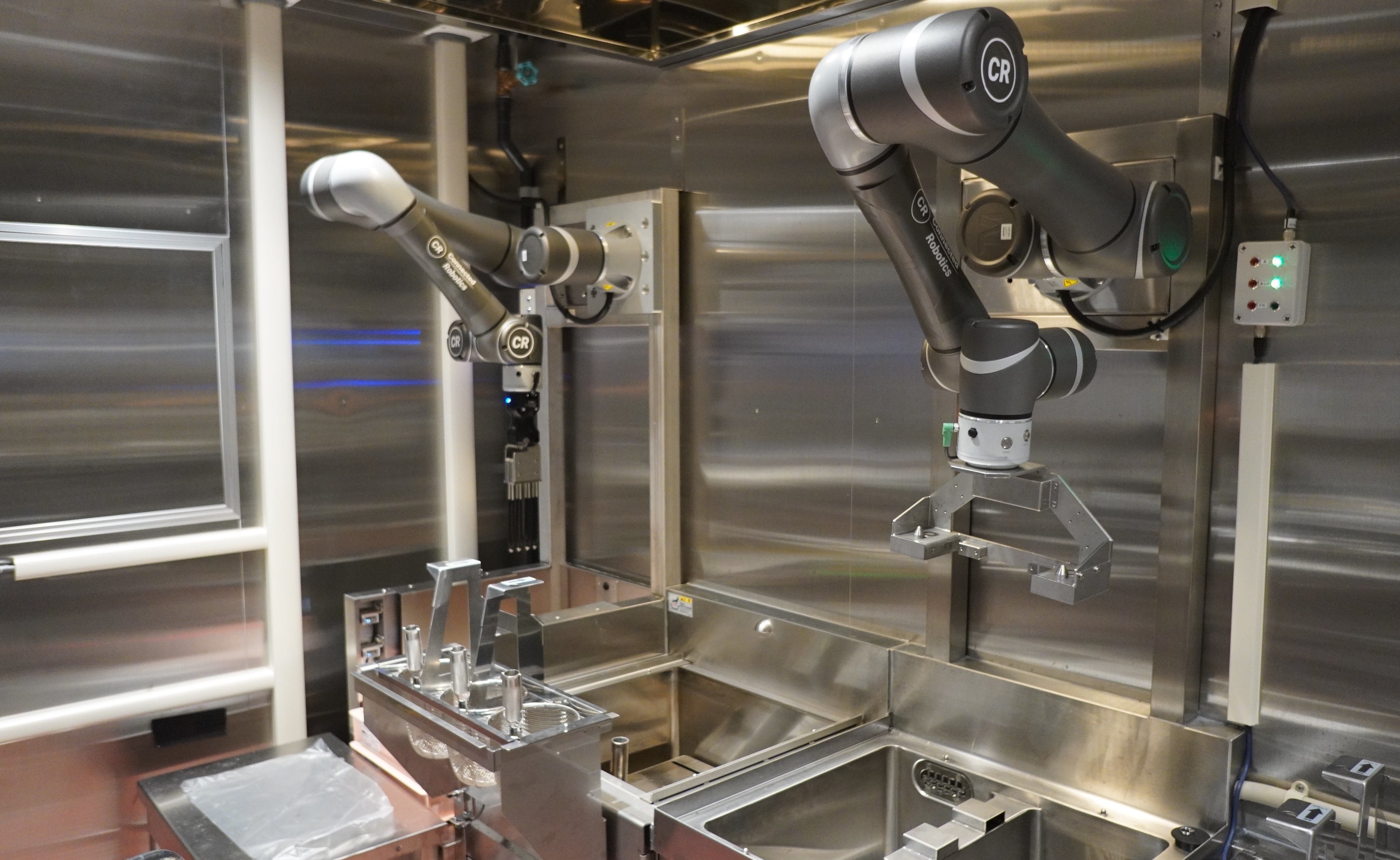 1本目のロボットアームが生そばを番重(仕切り付容器)から取出しテボ(茹で用ザル)へ投入し、その後、2本目のロボットアームにより茹でる、洗う、締めるという一連の調理工程を行います。
