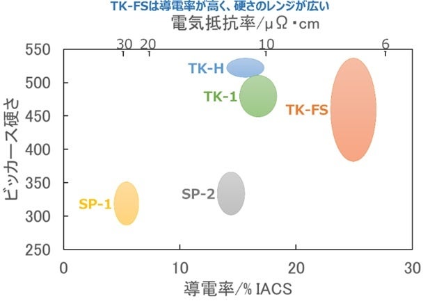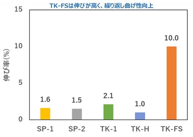 ・ビッカース硬さが500以上、7.0µΩ・cm以下の電気抵抗率を持ち、10回以上の繰り返し折り曲げ耐性(当社基準)といった3つの機能を同時に達成