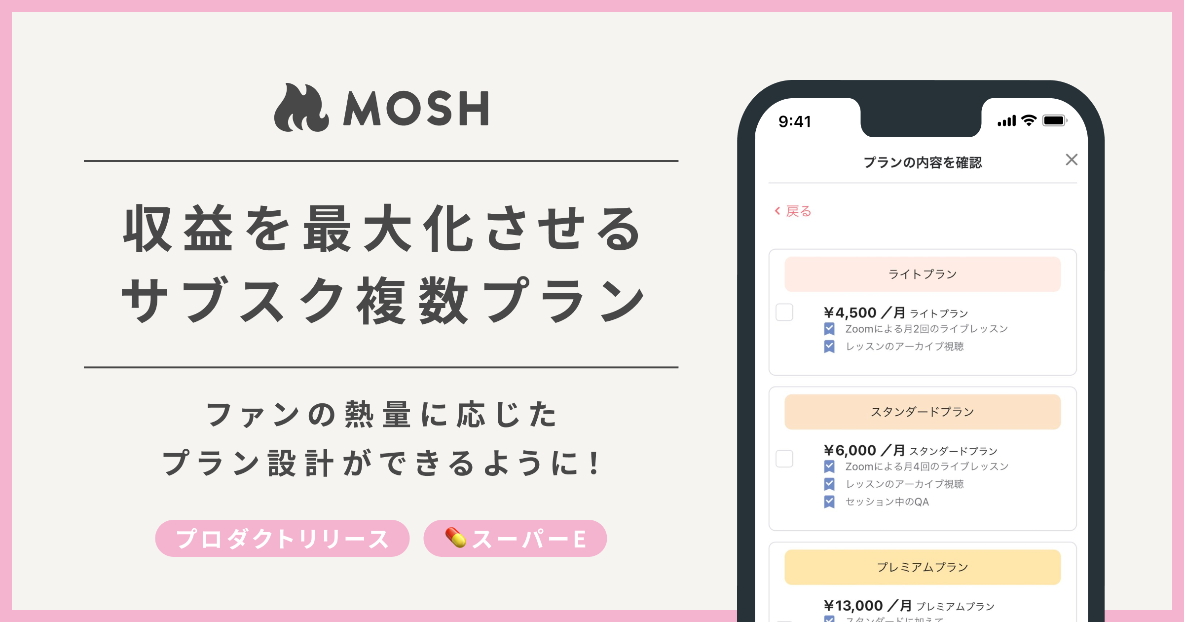 MOSH株式会社(本社:東京都目黒区、代表取締役社長:籔 和弥)は、 ネットでサービスを売れる個人ブランド支援サービス「MOSH」にて、「サブスク複数プラン」の機能をリリースしたことをお知らせします。