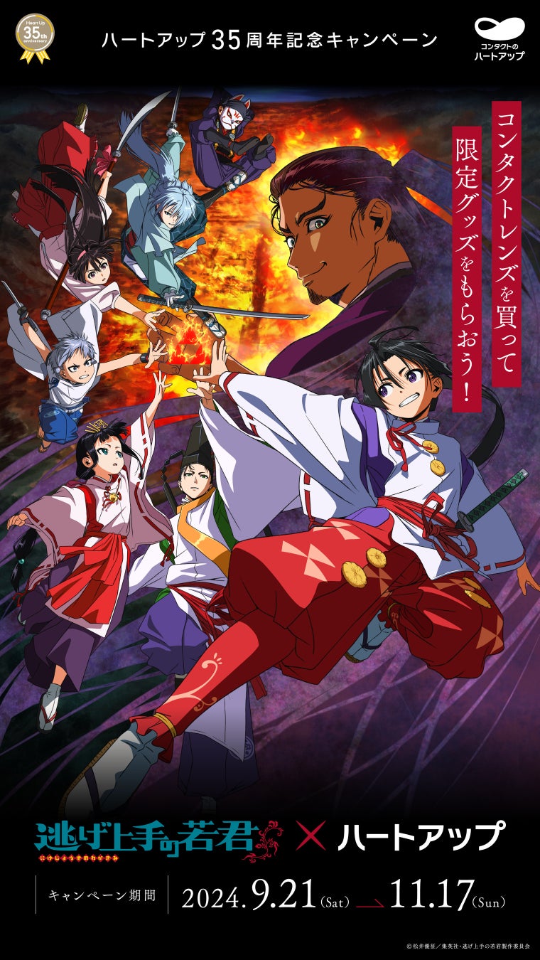 株式会社日本オプティカル(本社:愛知県名古屋市 代表取締役社長:前田貴志)は、2024年9月21日(土)より、コンタクトレンズ・メガネ専門店ハートアップと、現在大好評放送中のTVアニメ「逃げ上手の若君」(原作:松井優征(集英社「週刊少年ジャンプ」連載))がコラボした、「逃げ上手の若君×ハートアップ キャンペーン」を、全国のハートアップ店舗で実施いたします。