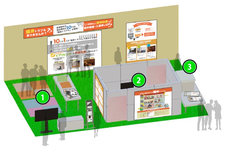 イベントでは、防音マット・防音カーテン・防音パネルを使って作られた防音部屋を展示する予定です。実際のお部屋を再現しているため設置イメージが湧きやすく、室内では防音効果を体感することも可能です。